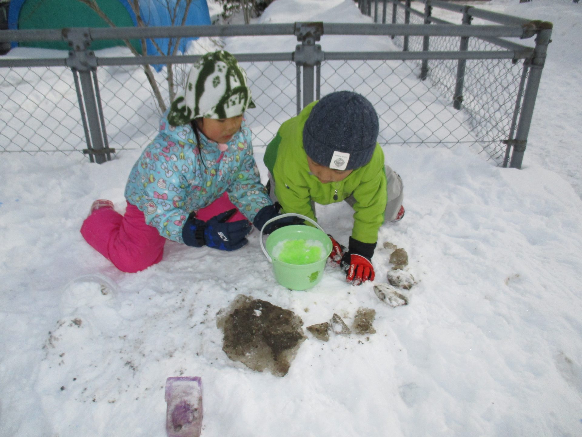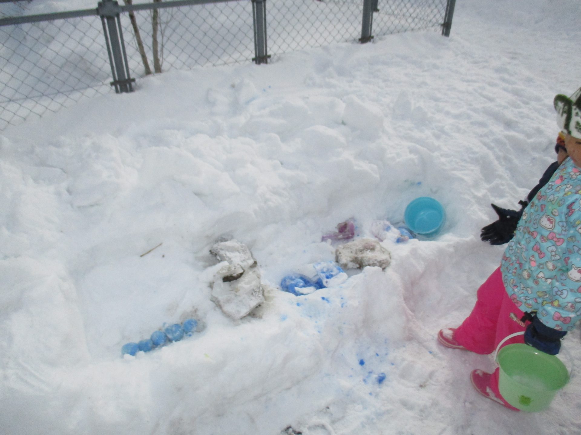 牛乳パックに色水を入れて凍らせた年長さんが氷を取り出しおもしろい形に凍っているのを発見しました。