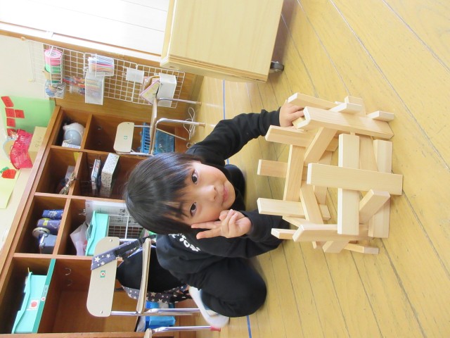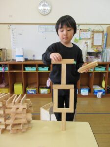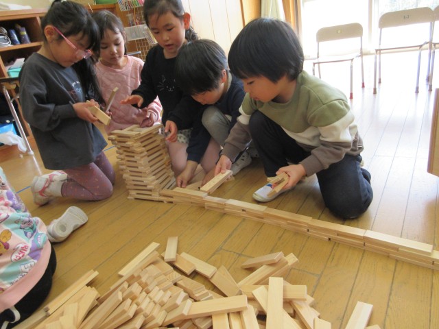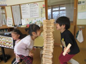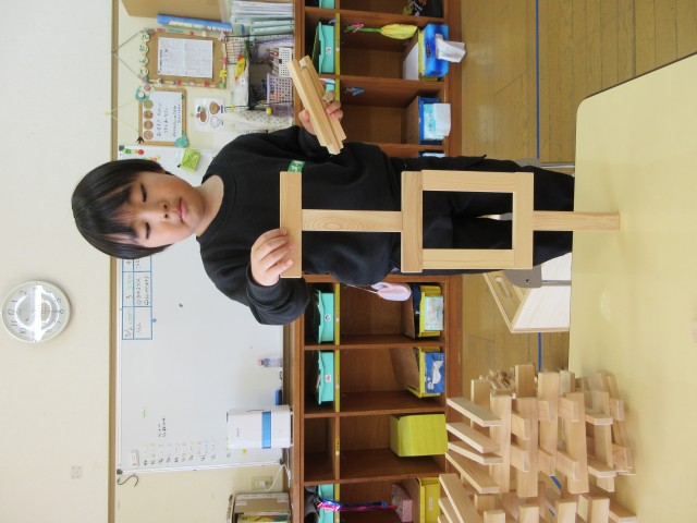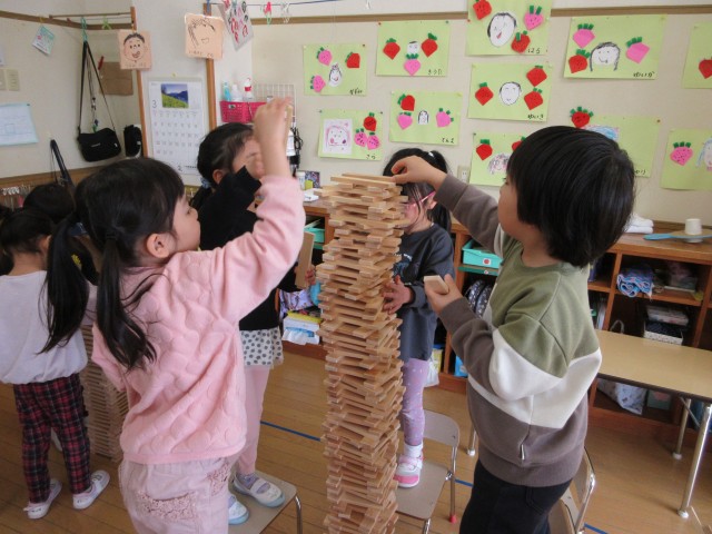 友達と協力して、自分たちの身長より高く積んで楽しんでいました。