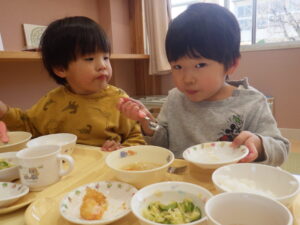 食べる機会が少なくなって来ている山菜を、折角だから食べてみようとふきのとう採りに出かけたが、採って来たものの、こども達は食べない子が多いだろうと思っていた。苦手と言って食べない子もいたが、食べてみると美味しさに気付く子もいた。何事もやってみないとわからないな、と改めて感じた。食でも春を感じていきながら、春の訪れをより身近に感じていけると良い思った。