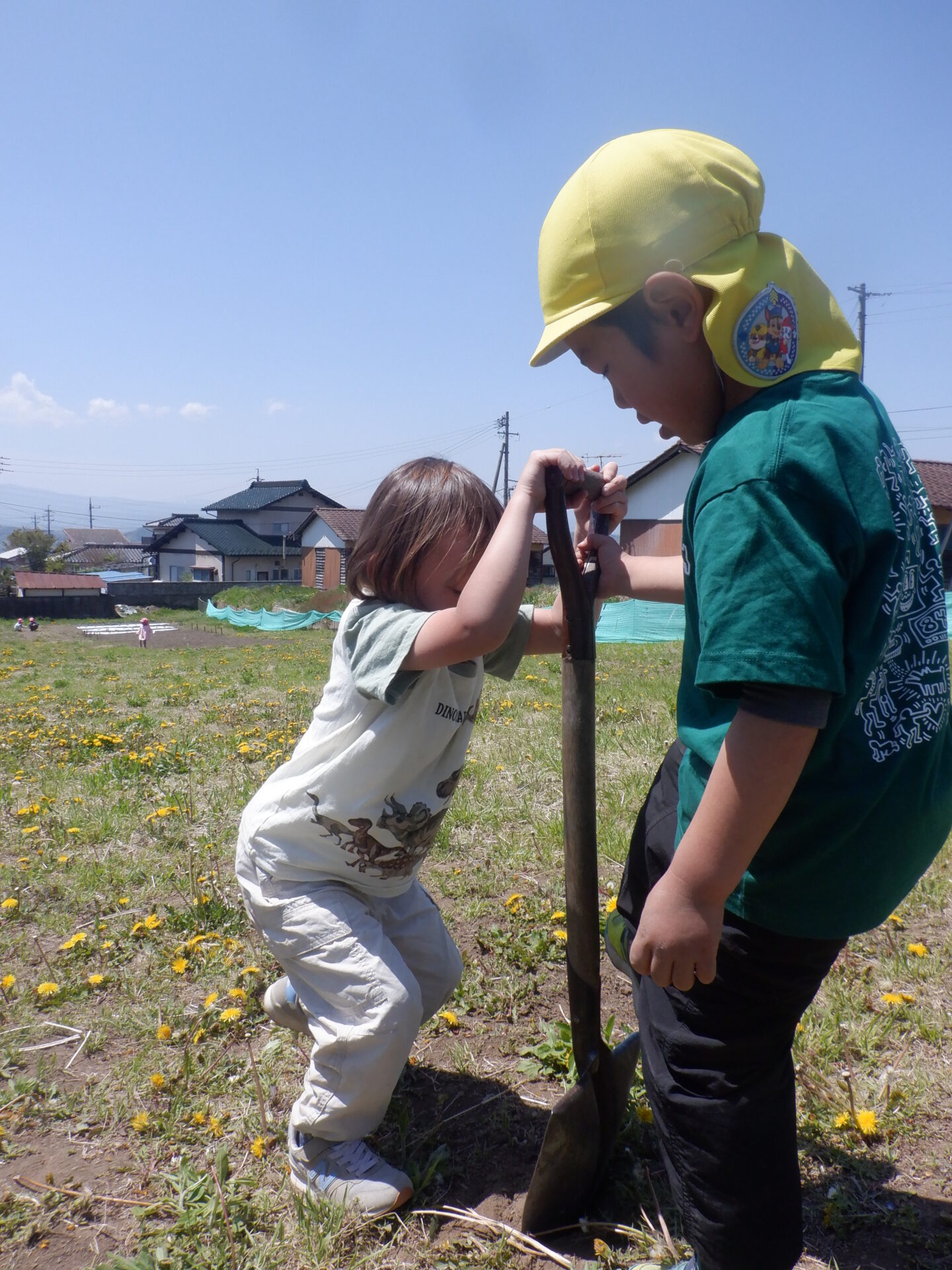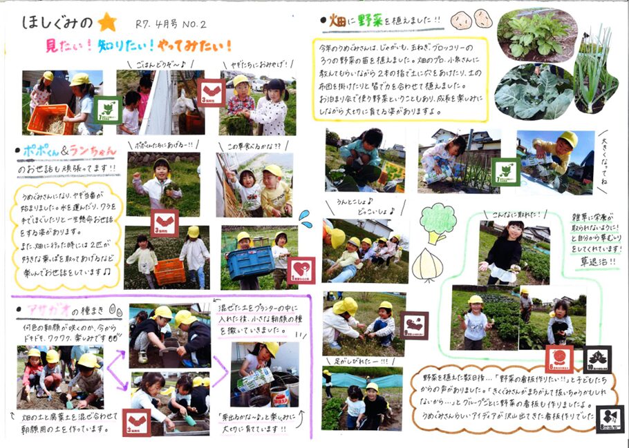 年長に進級し、任せられることが増えてきたうめ組さん。畑の野菜作りもその一つで「(昨年の年長さんの様に)みんなに喜んで食べてもらいたい!」という思いがあるようでした。