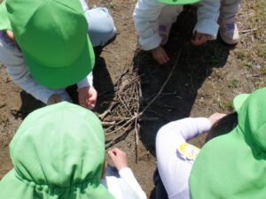 「(保育士)カラスの巣がどうなってるか上から見たいね」「(子ども)鳥さんみたいに飛べたら見れるのにね」と。カラスの巣作りごっこが始まったとき、子どもたちとこんなやり取りをしたのです。”見えないからこそ気になる!″この点が、子どもたちや保育士の興味をよりくすぐっていたのではないかと思います。「巣の中はどうなってるのかな?」「カラスは今何をしているのだろう?」「赤ちゃんはいるのかな?もう生まれたのかな?」と子どもたちといろいろな会話を楽しみました。見えない部分の想像をしながら自然と関わることもまた面白いなと気づかされた時間でした。