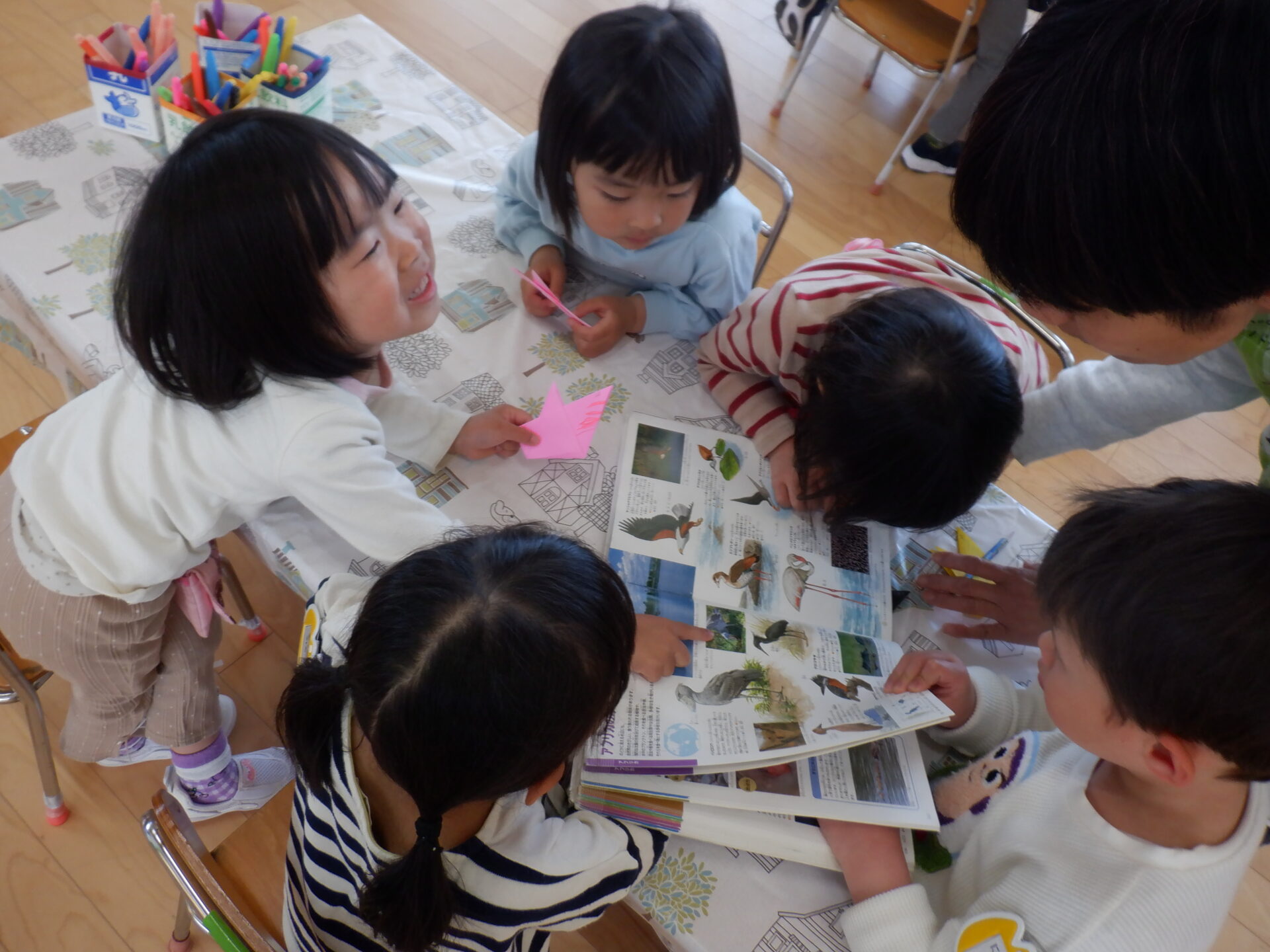 また、図鑑で調べたり制作をしたりしたことで、鳥への関心がさらに高まったように思います。今後も戸外遊びや散歩で鳥の発見や観察を楽しんでいきたいと思います。