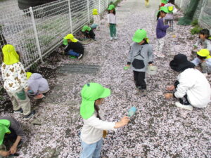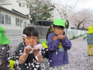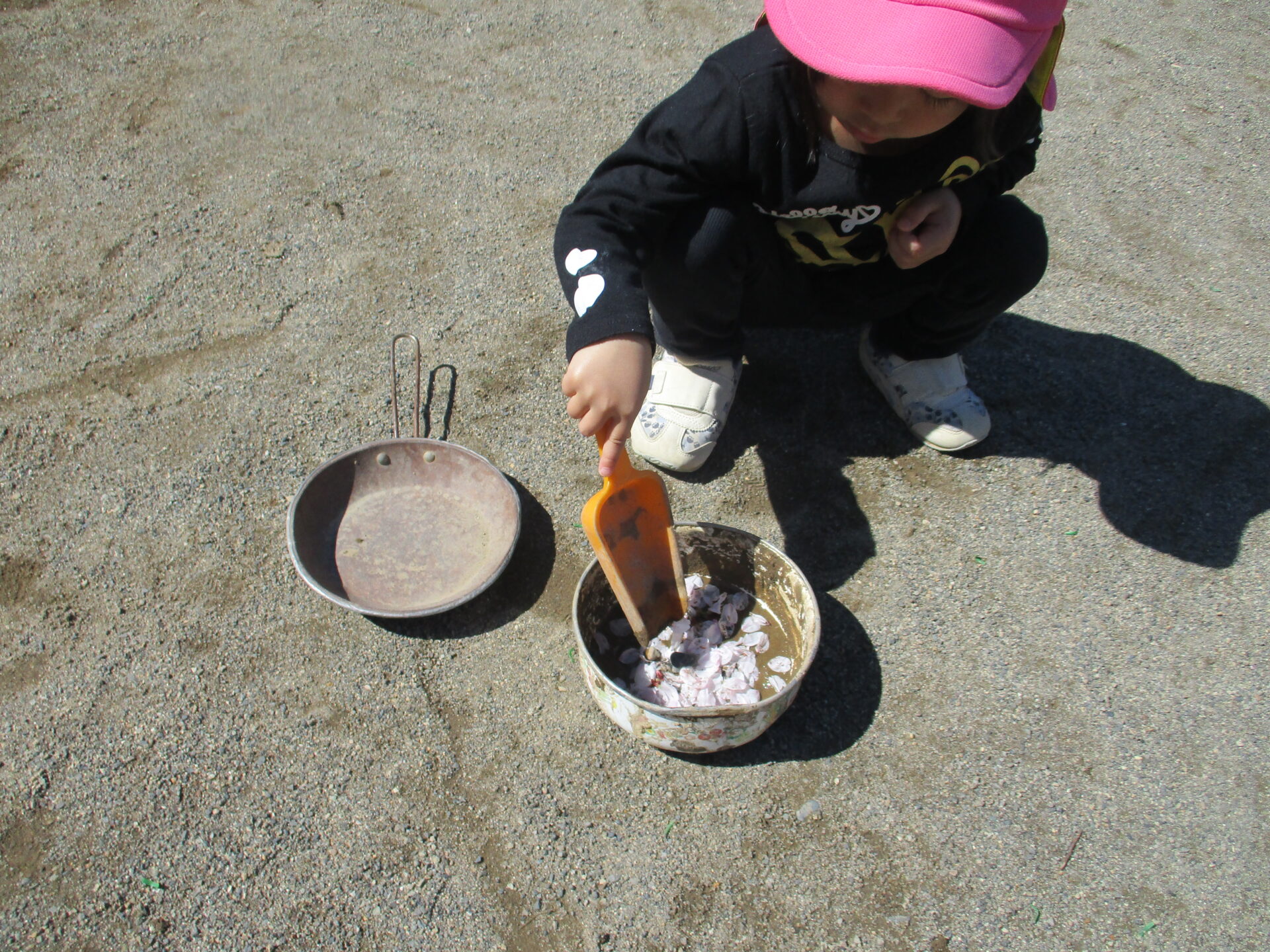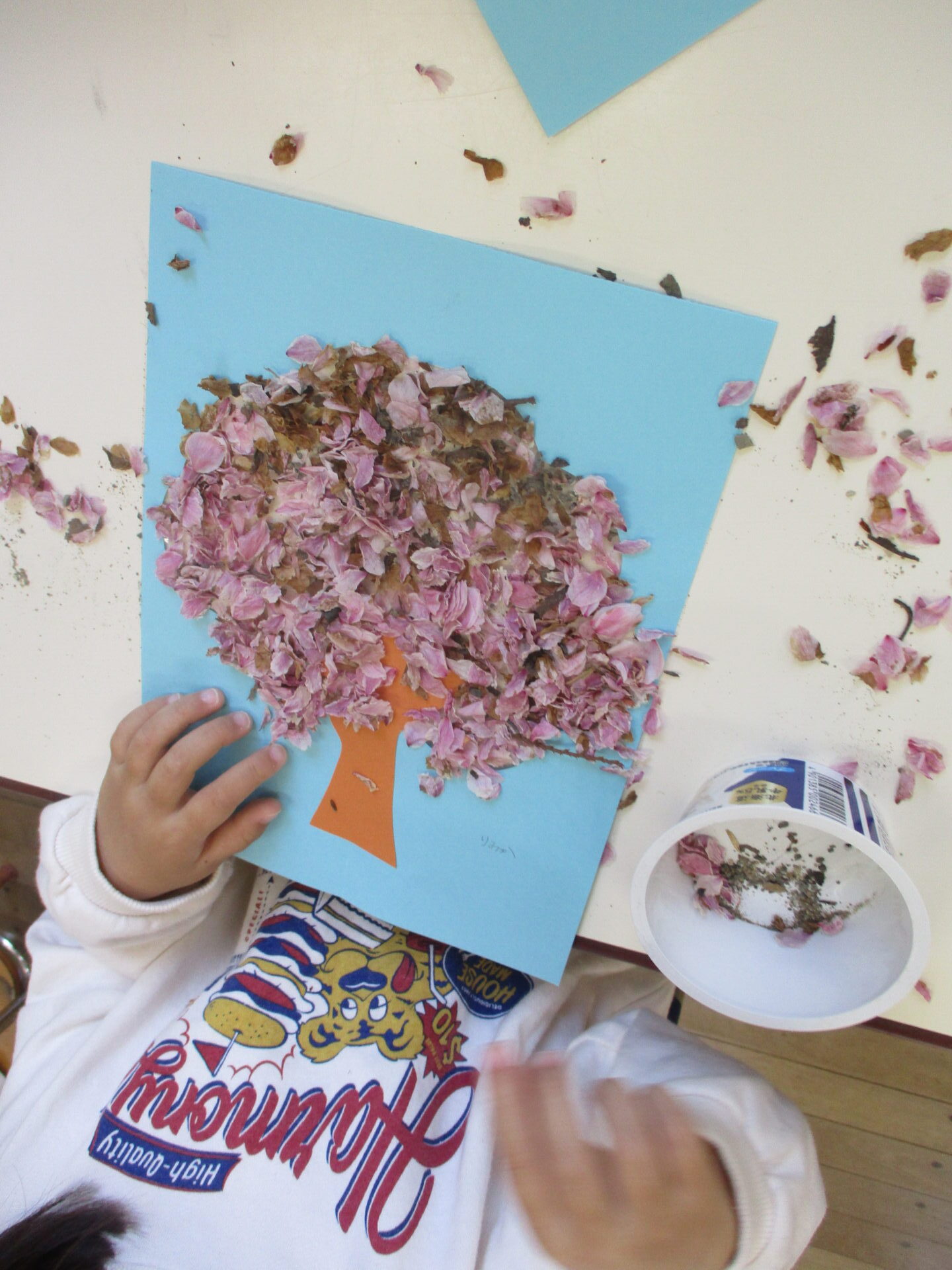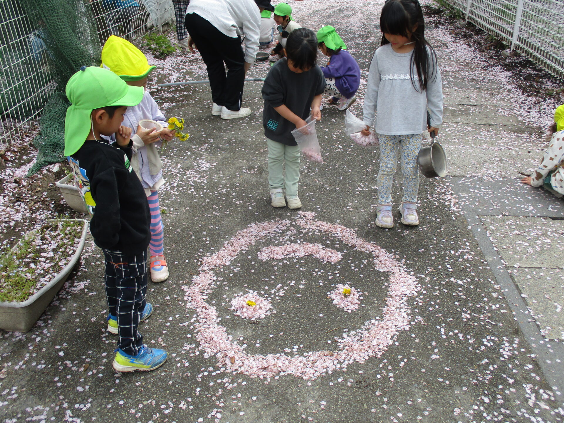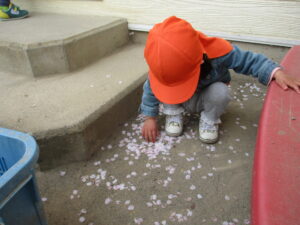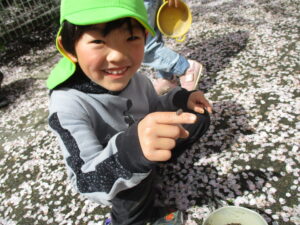 「きれいだね」「お料理しよう」「桜の下でご飯食べると気持ちいいね」「お家へのお土産にしよう」と色んな事を感じて遊んでいました。