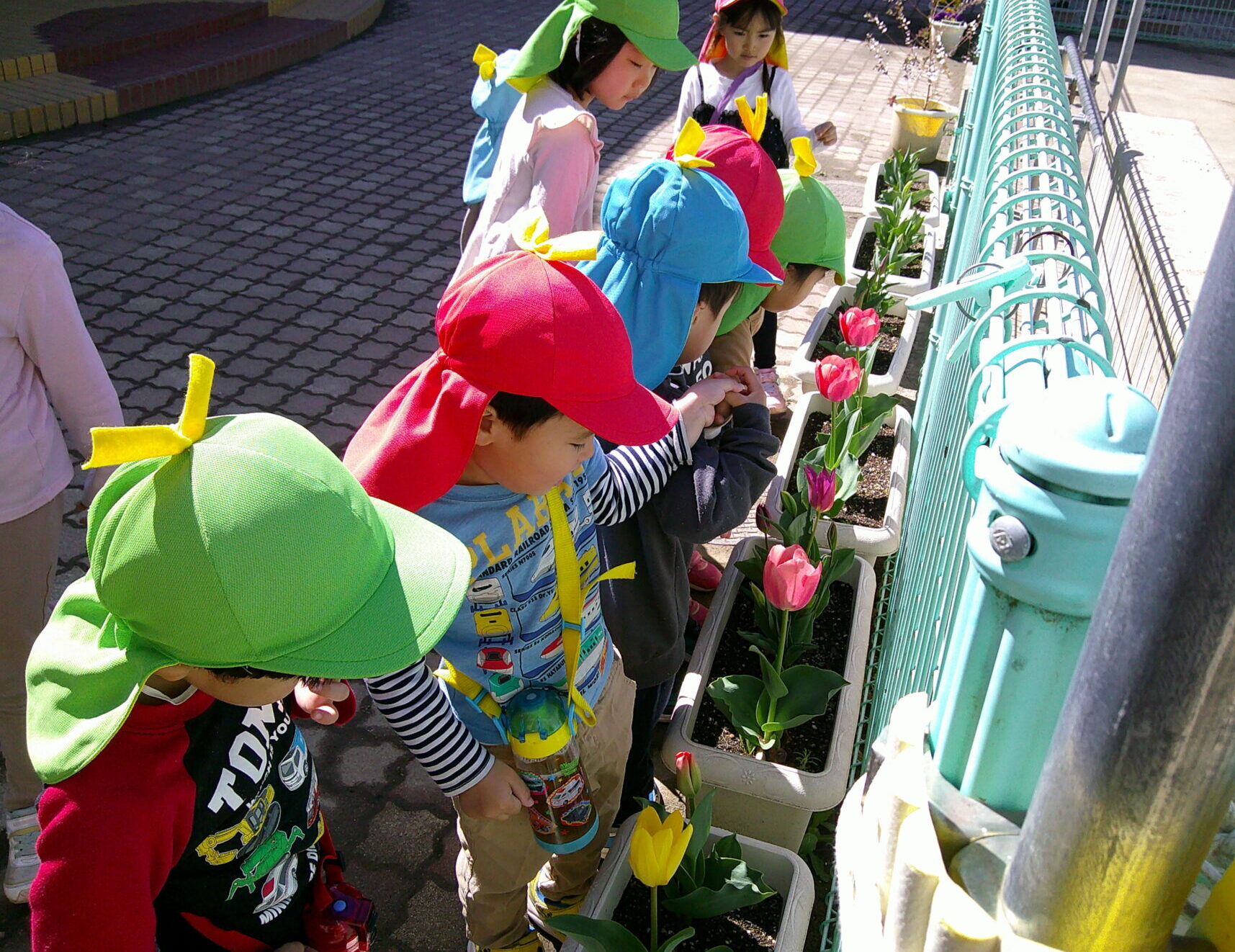 チューリップをみんなで見ていると、”赤と紫で形が違う”という話題に!よく見ると、「あ、なんか葉っぱもギザギザしてる!」と気づきました。まだ咲いていないものを見て、「これ葉っぱがギザギザしてるからきっと紫のチューリップだよ!」と予想している子もいました。何色の花が咲くかな?!