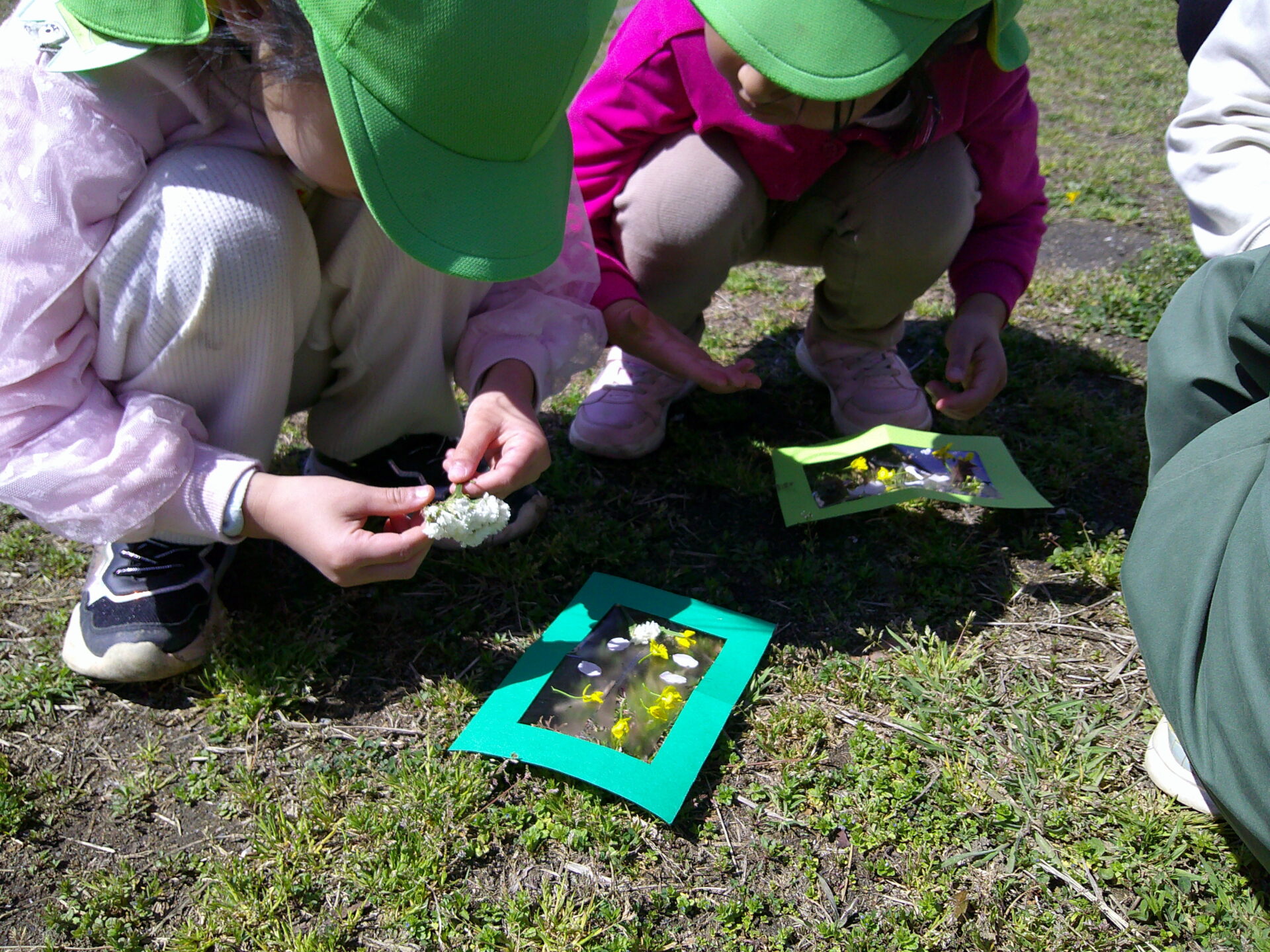桜の花びらや畑の菜の花、タンポポなどを見つけ、ペタペタ貼り付けていくと…。自分だけのきれいな作品になりました!