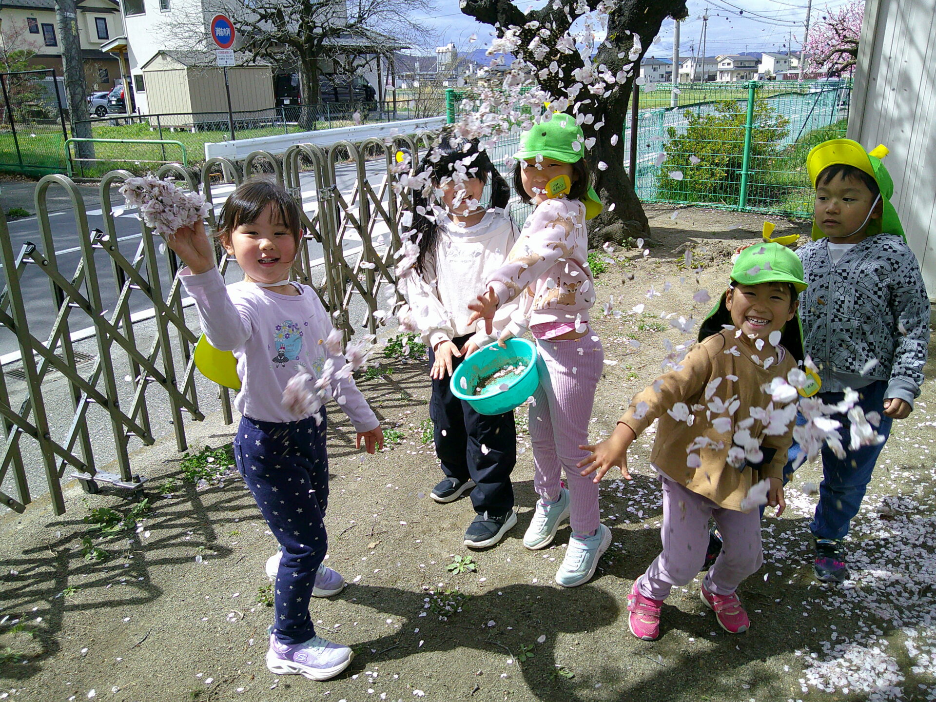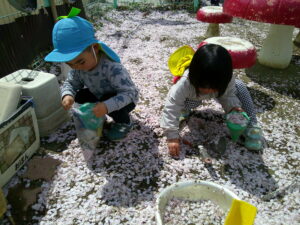 桜の花が散って、園庭一面がピンク色に!袋や容器を持ってきてぱんぱんに詰める子どもたち!何に使おうかな?