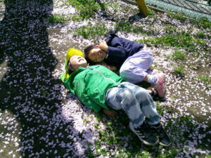「桜の絨毯みたいだね、ここで寝ちゃおう!」とても気持ちよさそうですね。