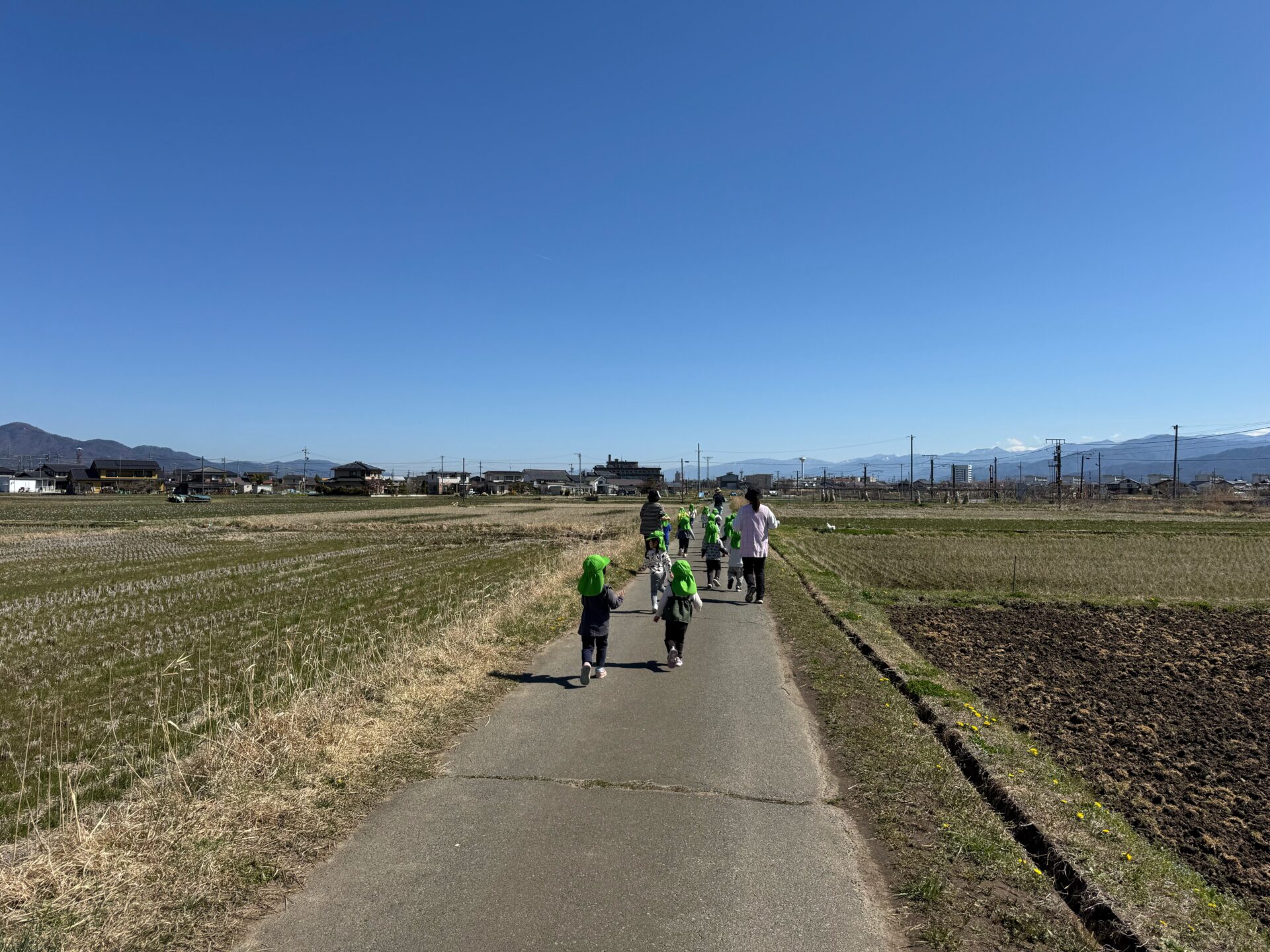 幼児組は毎朝、農道でマラソンをしたり、未満児組も農道散歩に出かけて自然に触れながら散策をしたりしています。