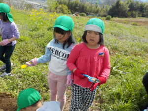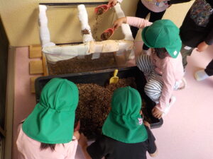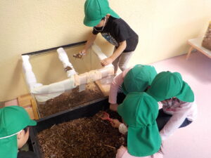 ・幼虫を見て始めは抵抗のあったこども達も、保育士やお友だちの様子を見て自らやってみたい、自分の手で取ることができた。という満足感も味わ事ができたと思う。