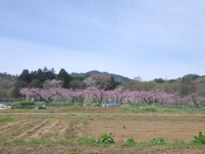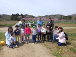 畑に付くと見晴らしがよく、桃の花が咲き、遠くの山には雪が残っている景色を見ることができました。
