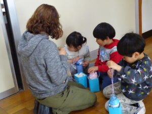 ちょうど水筒が入るサイズだったようで、入れてみていたところです。視線が左奥を向いているのは、鬼無里の妖精”きなこちゃん”からの手紙を発見したからです。