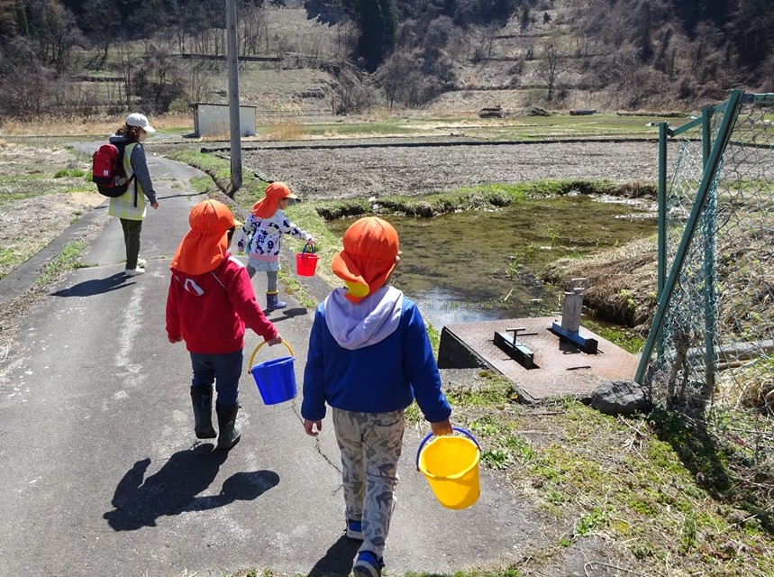 〇カエル池の散歩は出発前に「何が必要かな?」と考え、ちゃんとバケツを持っていました。「網もいるんだけど・・」と保育士に伝え、準備万端です。(※網は長いので先生に持ってもらうことになりました)