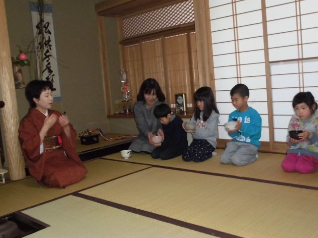 お正月らしい茶室のしつらえでおもてなしいただき、初体験の茶道を体験した子ども達。