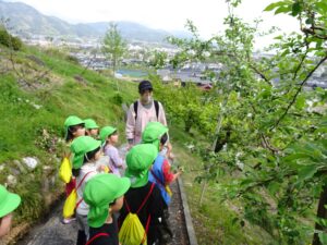 りんご坂チーム、りんごの木に白い花が・・・保「これなんの花かわかる?」子「白い花の木でしょ?」