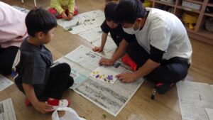 ・友だちがみつけたことに興味を持ち、一緒にやってみようという気持ちが持てるようになってきている姿はうれしい。