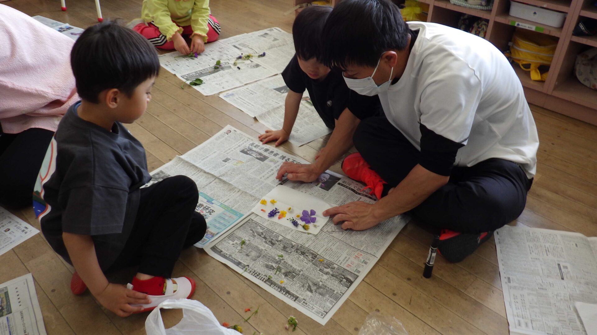 園に帰って、それぞれプレゼントしたい花を選んで押し花にしてみました。