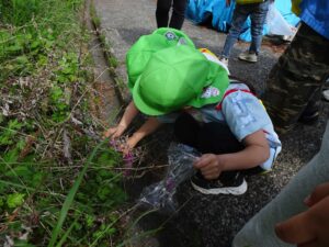 子「紫の花みつけた~。」「こっちはハルジオン!」とみつけては摘んでいくので、なかなか前に進みません。
