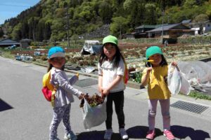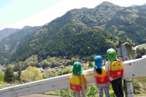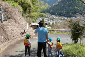 距離にして片道2.3㎞ほど。上り坂を頑張って歩いた子ども達です。大人もそうですが、車社会でドアtoドアの生活になりがちで、都会の人のほうが良く歩けるという話も聞きます。せっかくたくさんの自然があり、良い景色に温かい人達に囲まれているので、出歩かなきゃ損!(笑)と思っています。和田保育園と上村保育園、2拠点の良さを生かして色々な所に出かけ、しっかり歩いて多くの場所や人に自分達から関わっていけるようにしたいな😌、と思います。