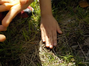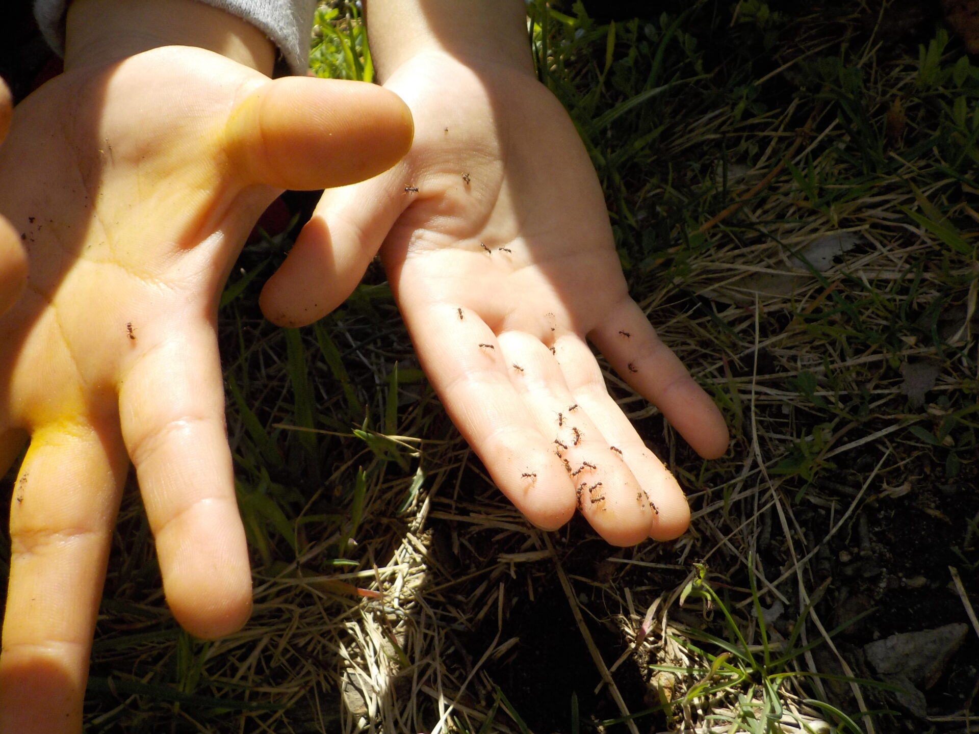 つぶさないように… そっと手を地面に当て、手に登ってくる様子をじっくり観察していました