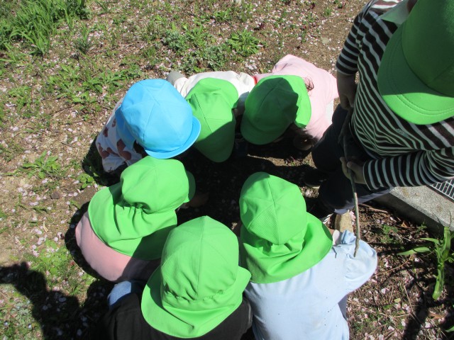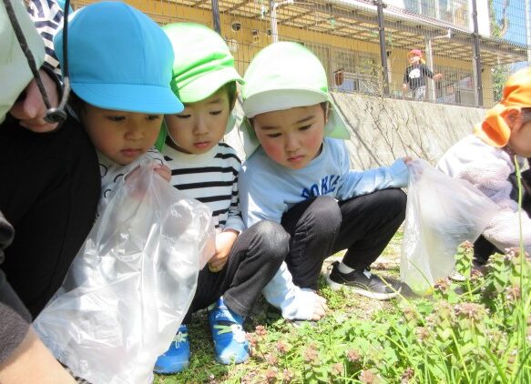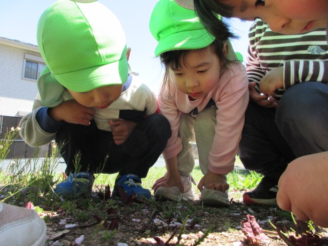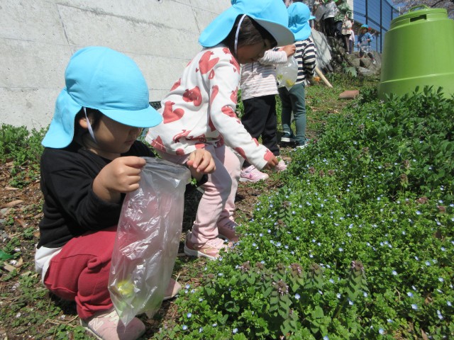 子どもたちは新しい環境での生活に慣れて、戸外でたくさんの“春”に触れて遊んでいます。