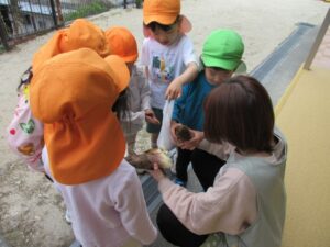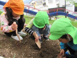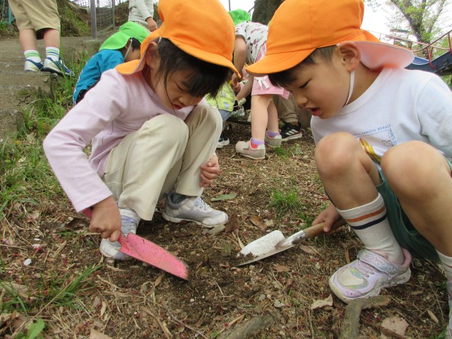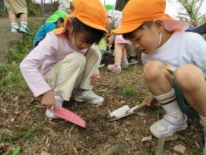 保育園の隣の東栄公園では、年中さんと年長さんが真剣な表情でたけのこを掘る姿。