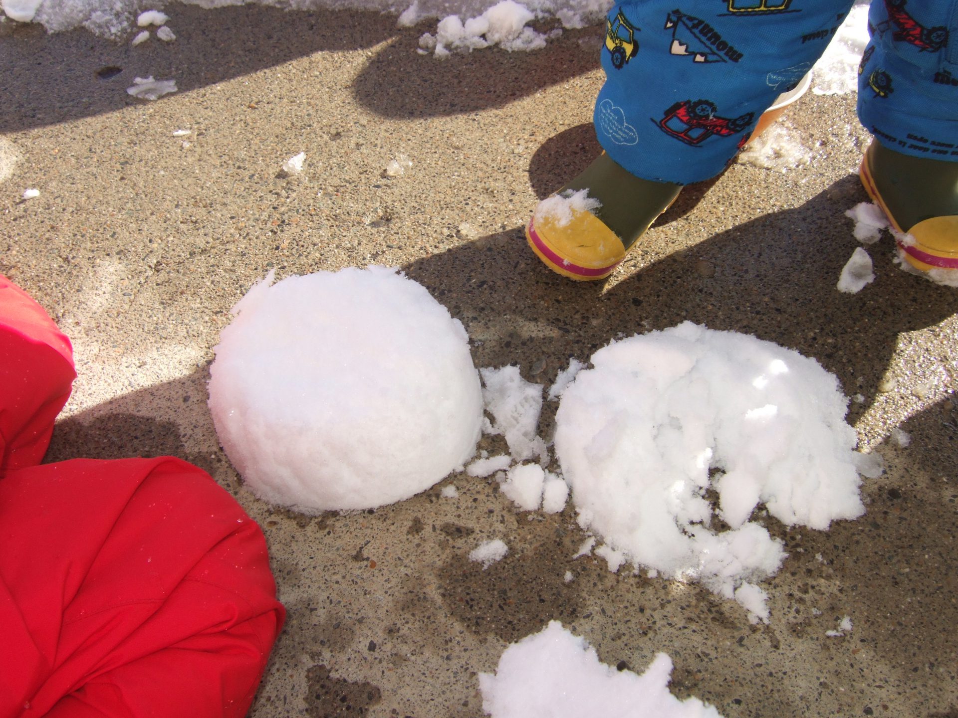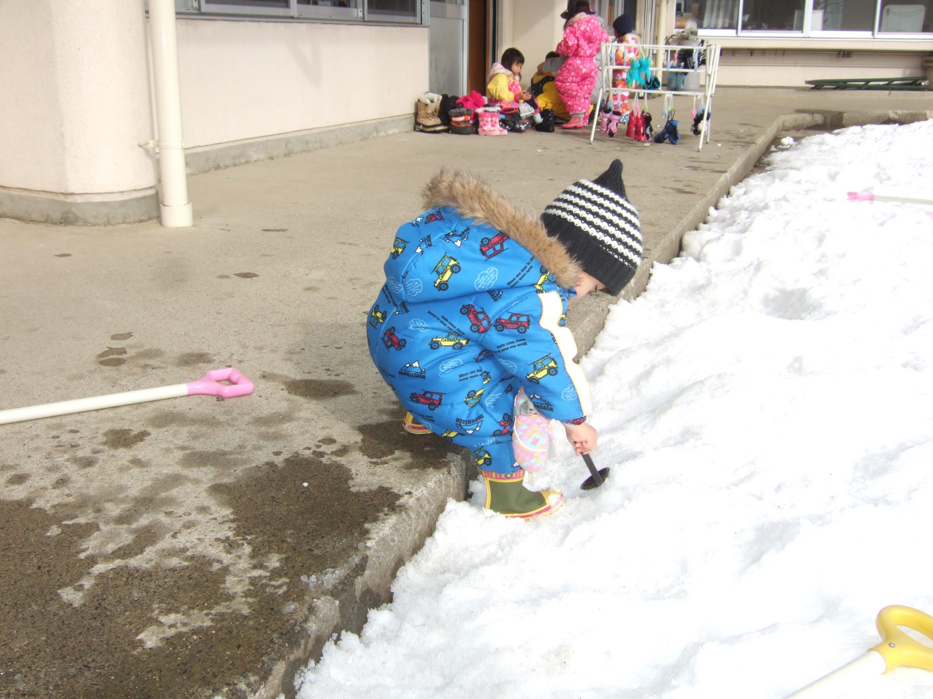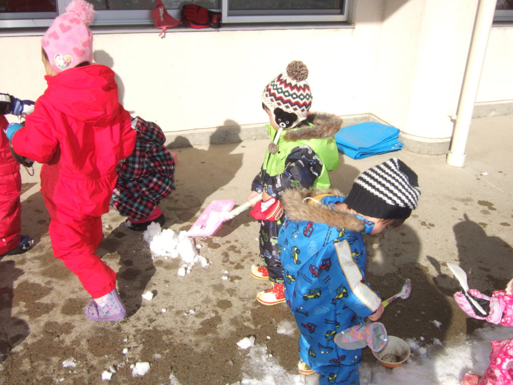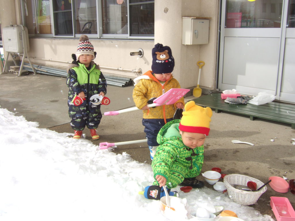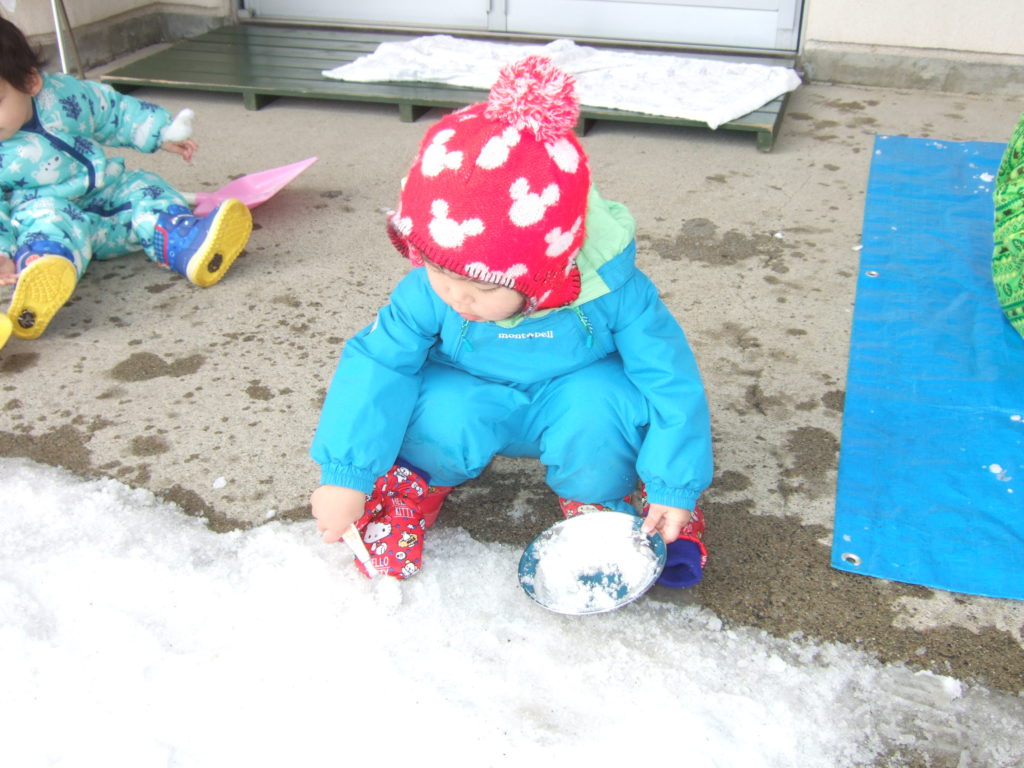 雪が降り何度も雪遊びを楽しんでいる子ども達。今では「外に行くよ〜」と声をかけると自分で帽子をかぶったりなんとか自分で防寒着を着ようとしたり身支度やってみようとする意欲にびっくりさせられます。