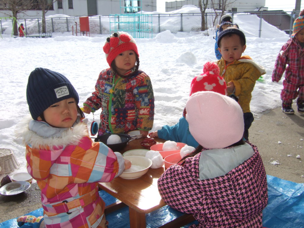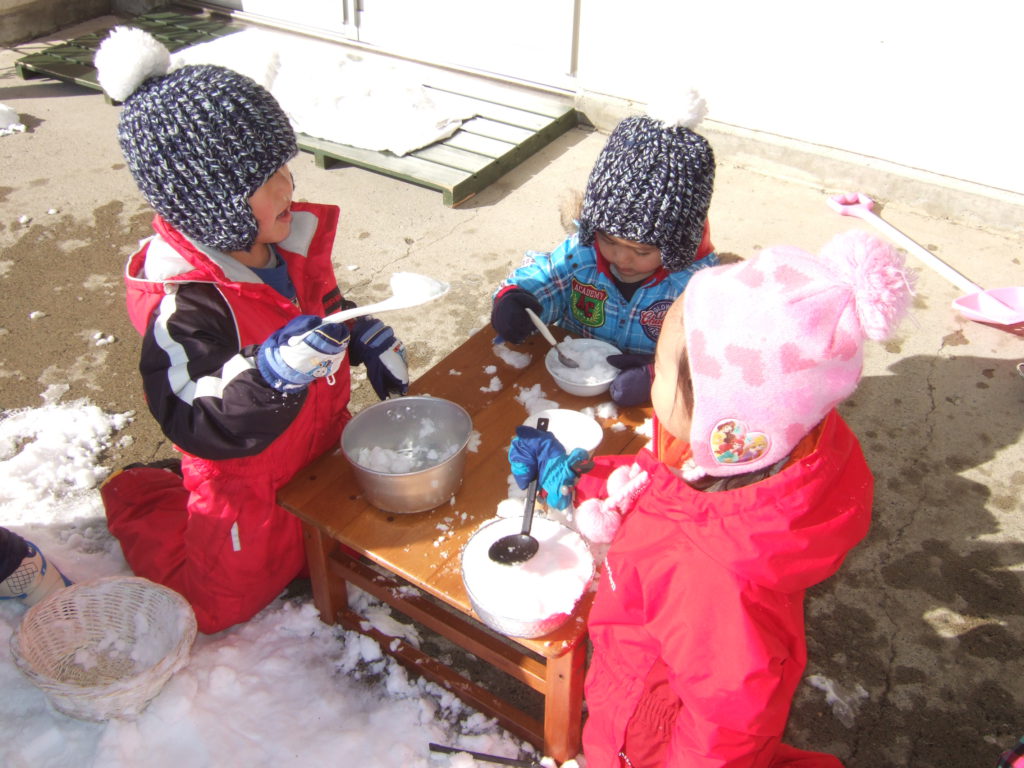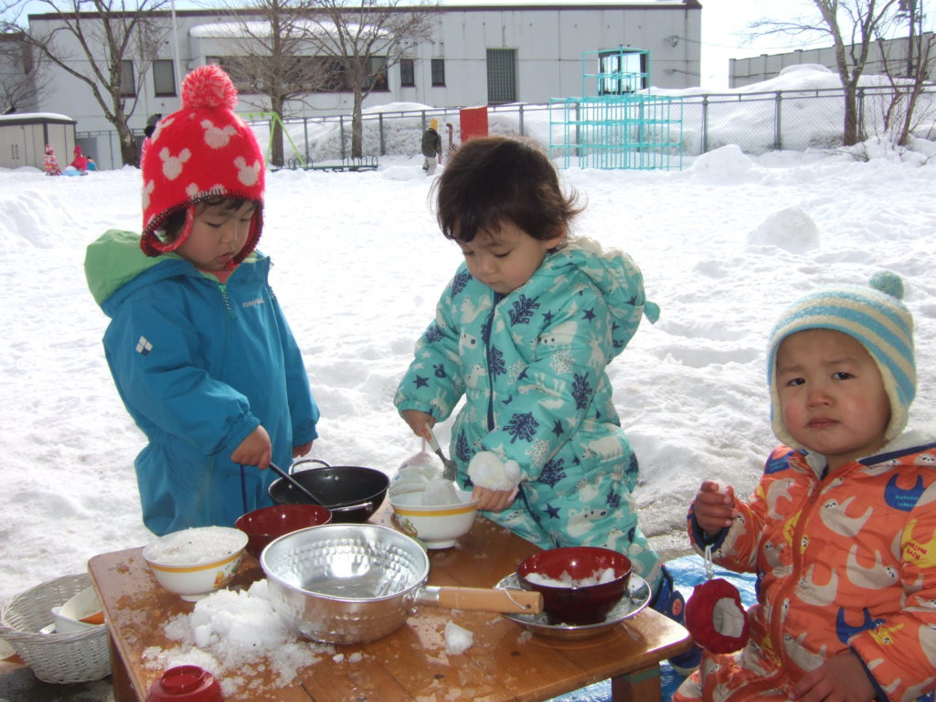 時には嫌々で涙な日もあるのですがその時は無理せず一人ひとりの気持ちにそって室内で過ごしたり廊下で過ごすこともあります。雪遊びもまだまだこれから。少しずつ雪になれ雪遊びの楽しさを感じられるよう子ども達と一緒に遊びながら信濃町の冬を楽しみたいです。