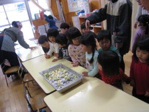 保育園では年始の恒例行事として『ものづくり・どんど焼き』を行っています。昨年度の様子を覚えている子ども達は『おもの』を「コレ 食べたらびょうきにならないんだよねぇ!」と頬張っていました。地域独自の行事も年々減っていく中で、保育園での行事を通して昔ながらの風習を経験できる『ものづくり・どんど焼き』という行事を大切にしていければと思います。