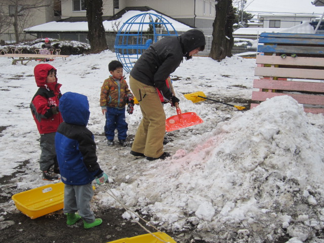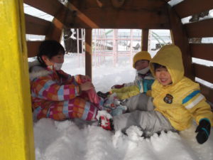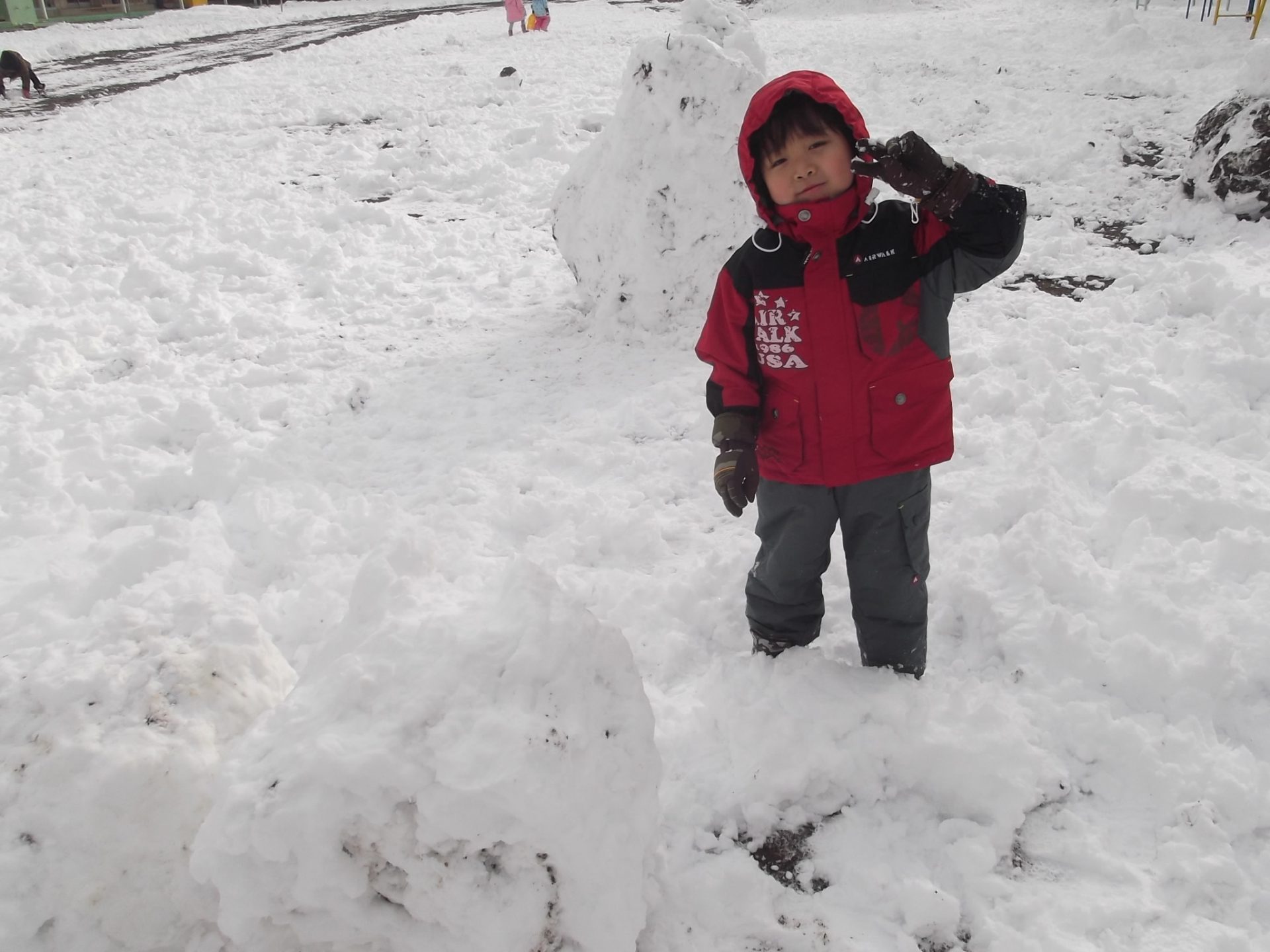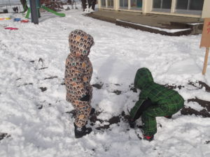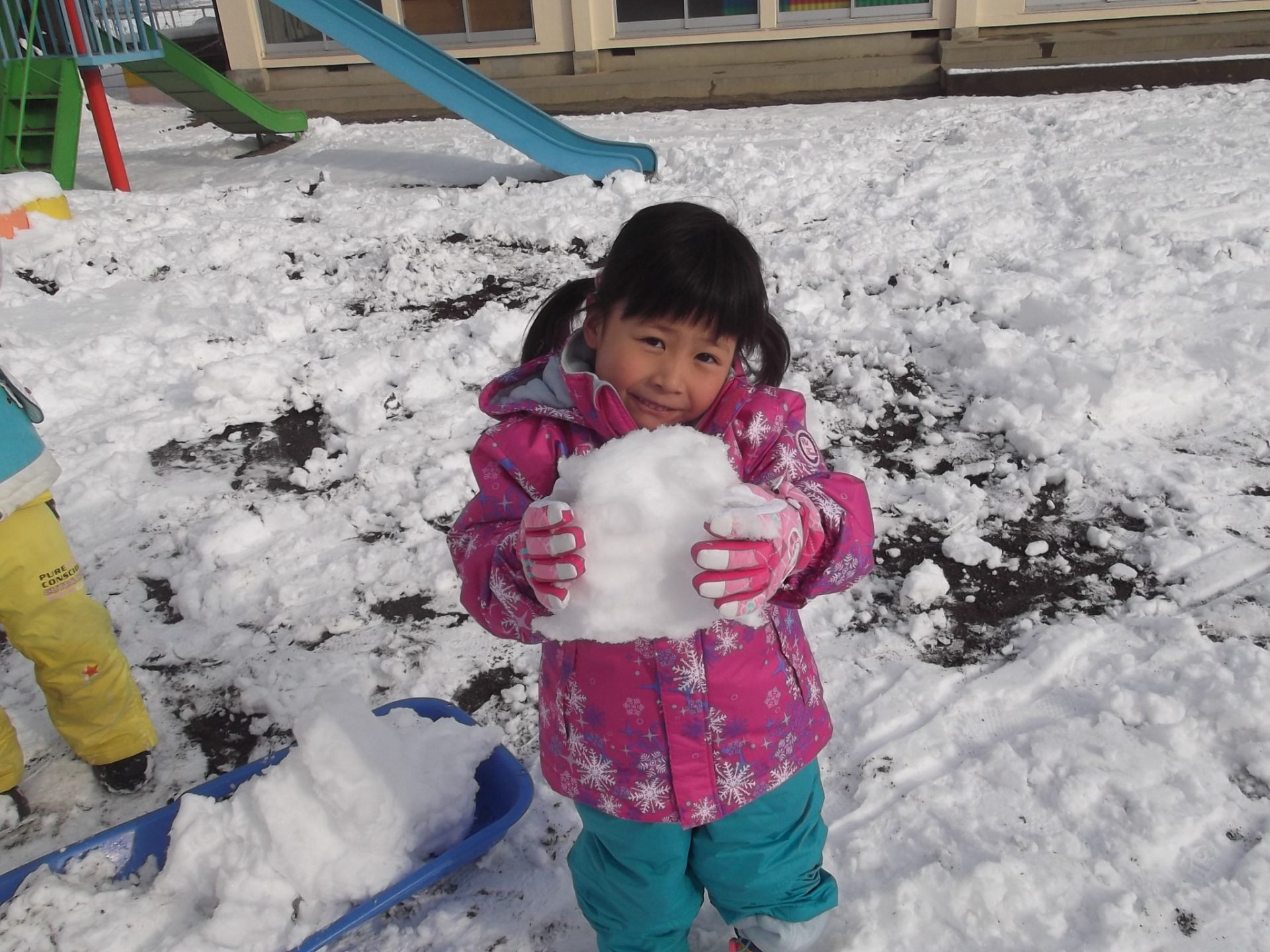 朝からスキーウエアをバッチリ着て、雪を踏みしめながら嬉しそうに登園してきた子ども達、早速雪遊びを楽しみます。