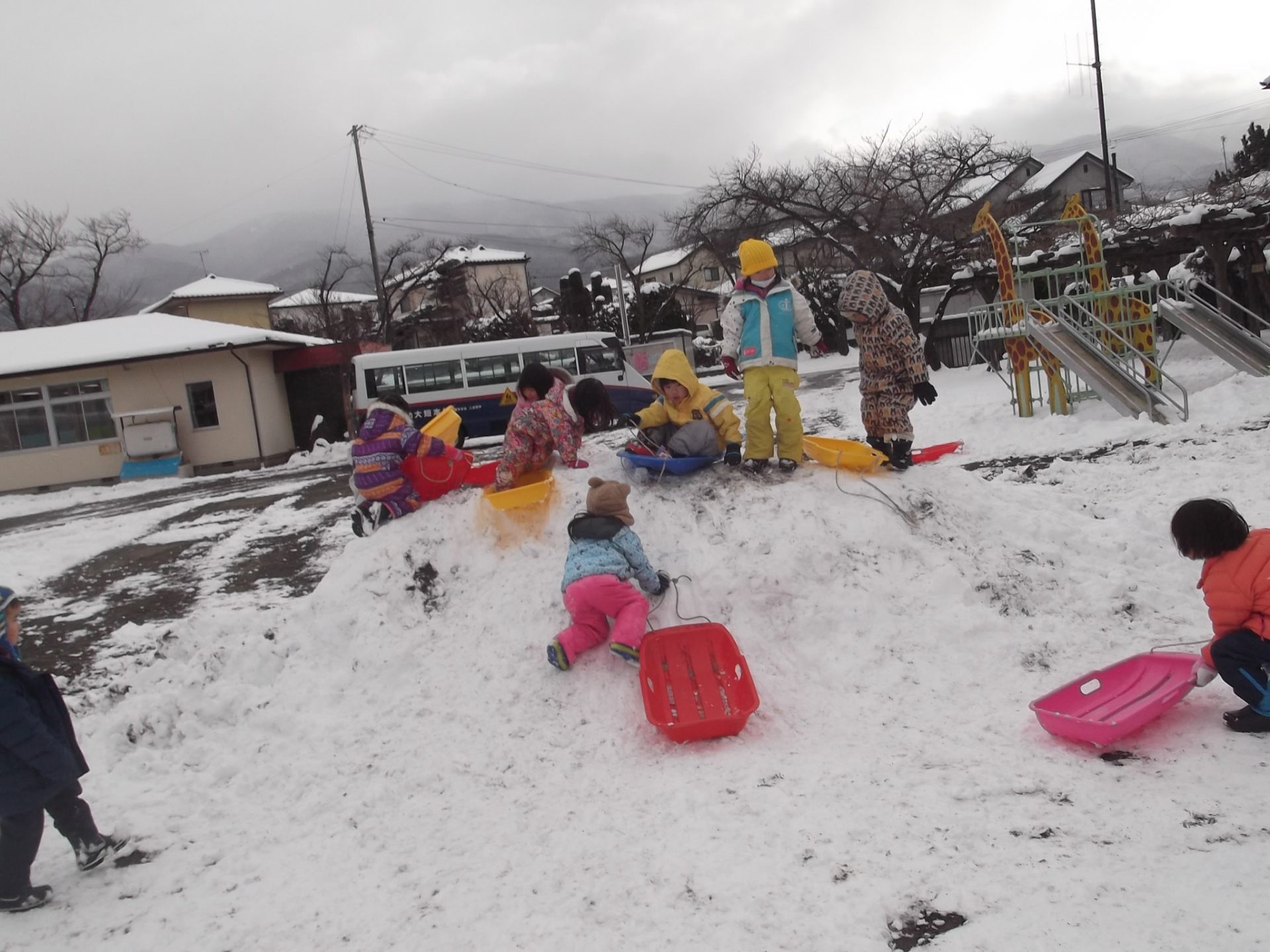 年中、年長さんが雪玉を転がしてどんどん大きくするのを見て真似してやってみる年少さんだったり、自分のイメージした雪だるまを作る年中さん、ダイナミックにそり滑りを楽しむ年長さんなど、それぞれ雪遊びを楽しんでいました。