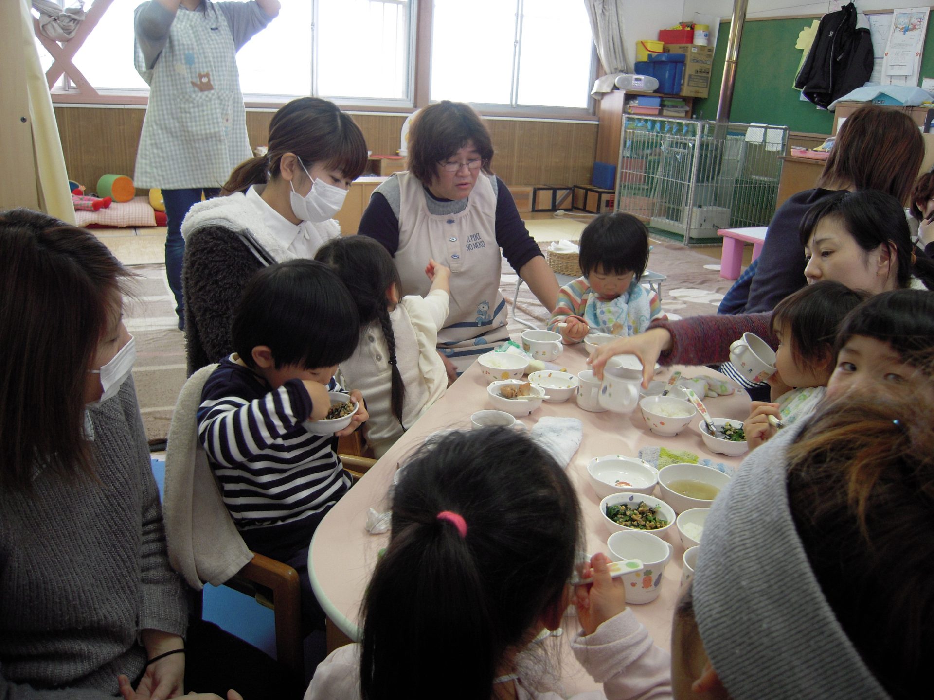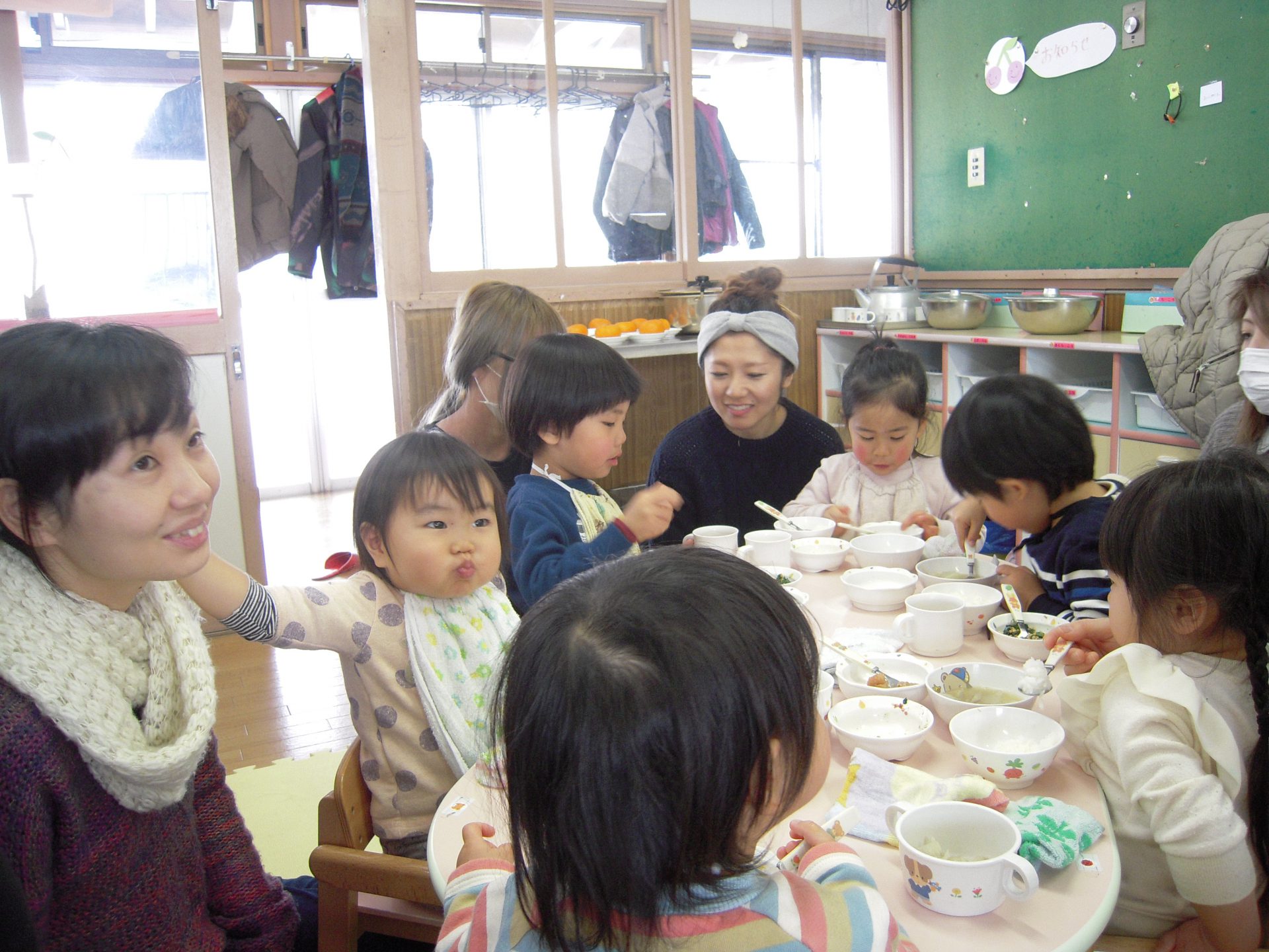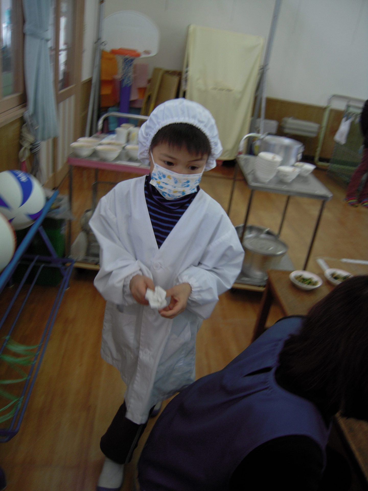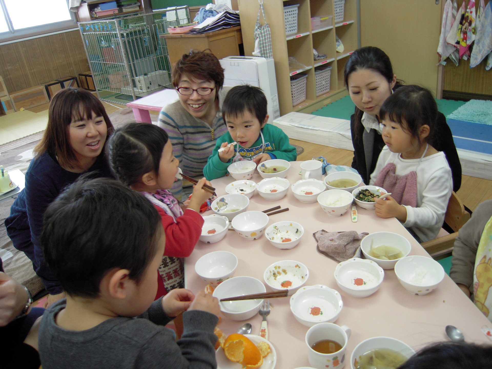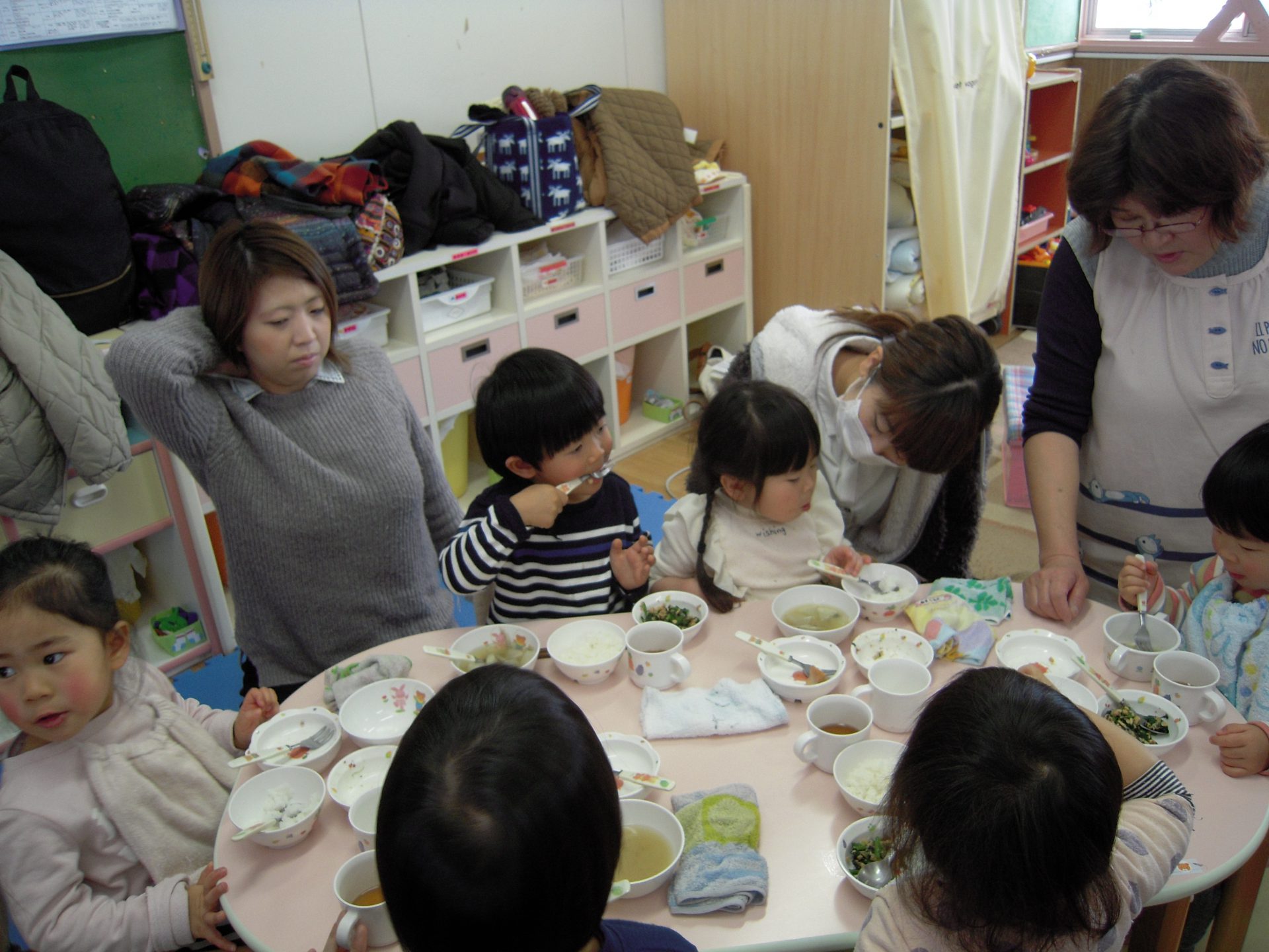 給食の時間には、給食の準備や給食当番、食事の内容などもわずかではありますが、味見をしていただき、保育園の給食について知っていただく時間を設けています。