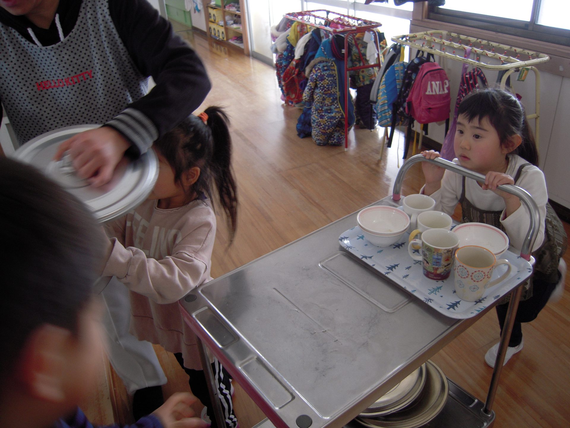 お当番さんが給食を盛り付け、給食の準備をしていました。