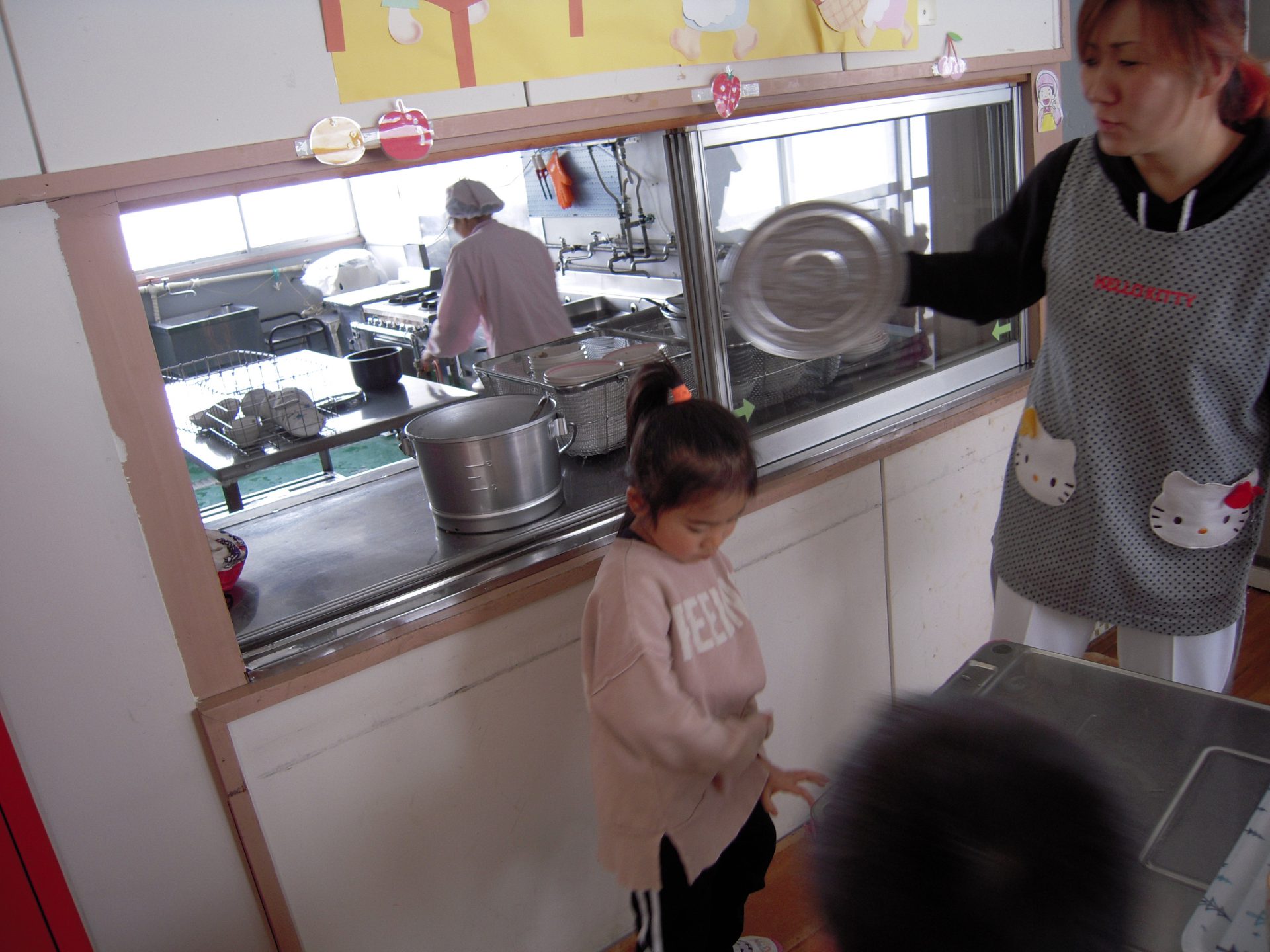 保護者の皆さんが帰られた後、給食室の前でお当番さんが最後のお仕事。