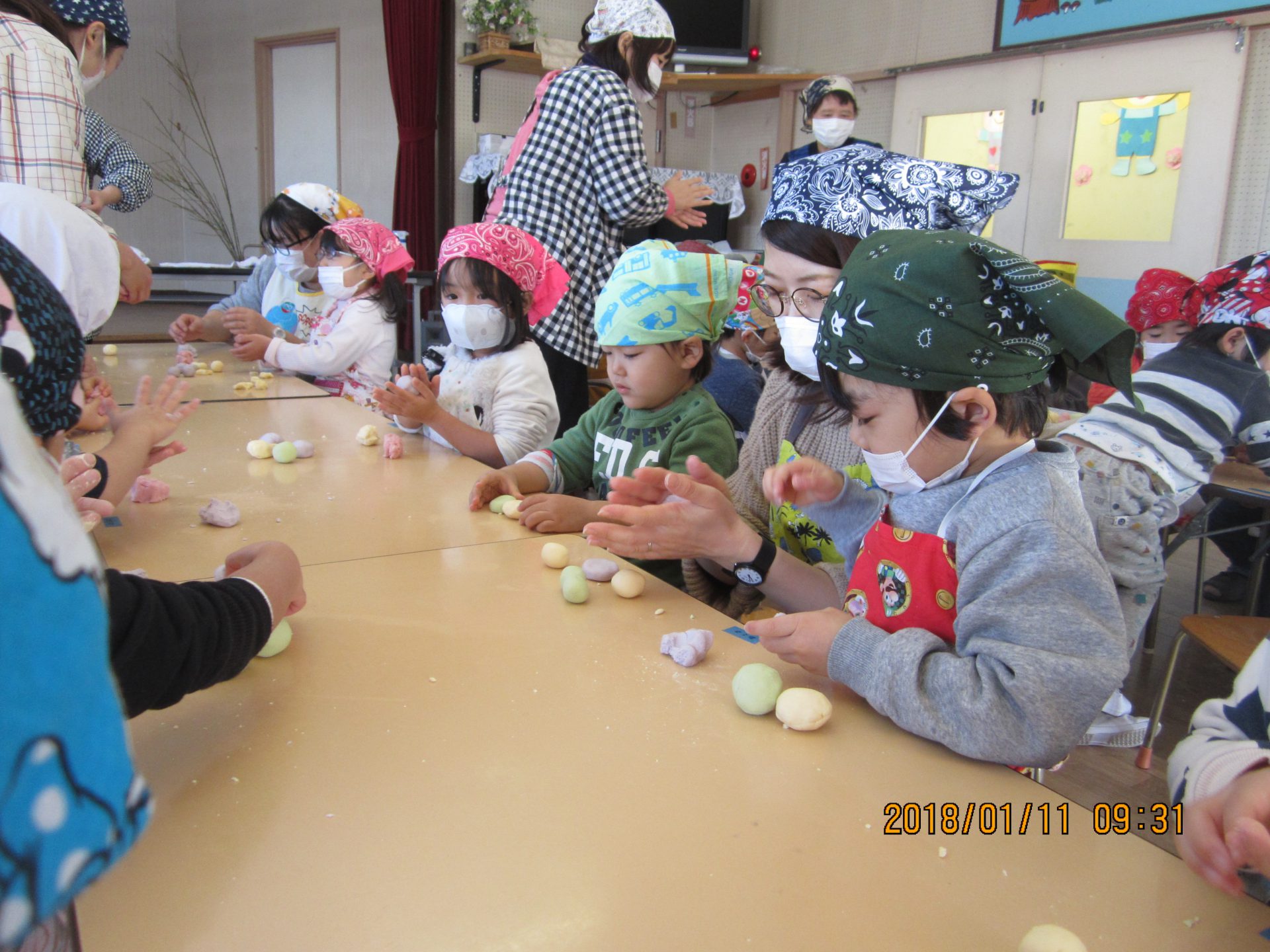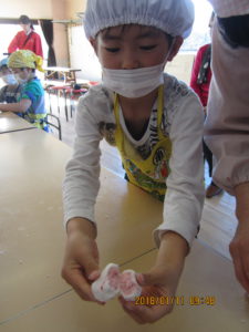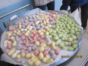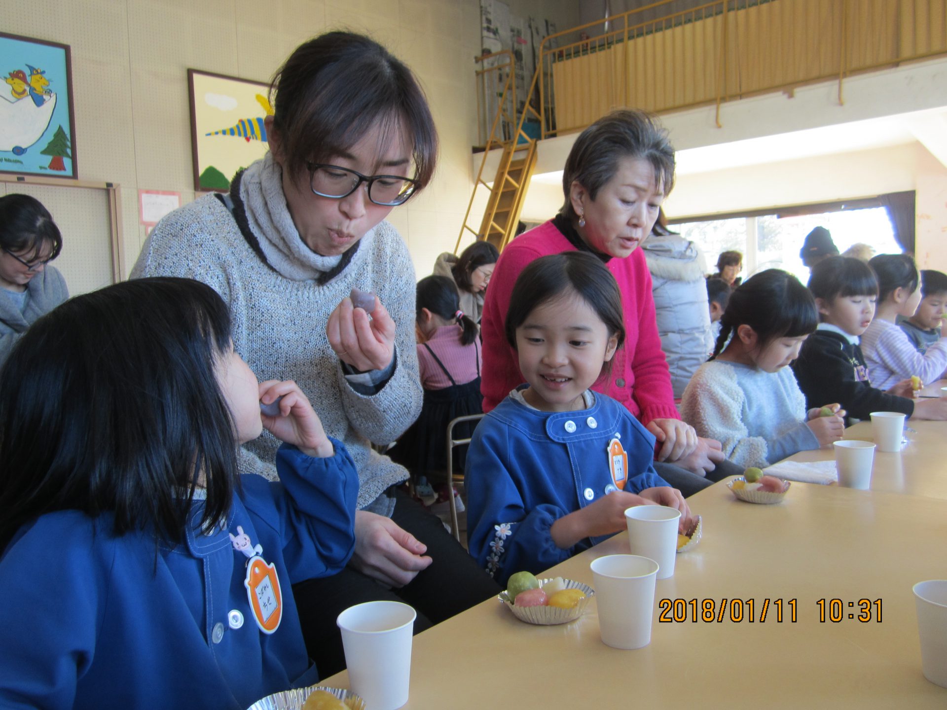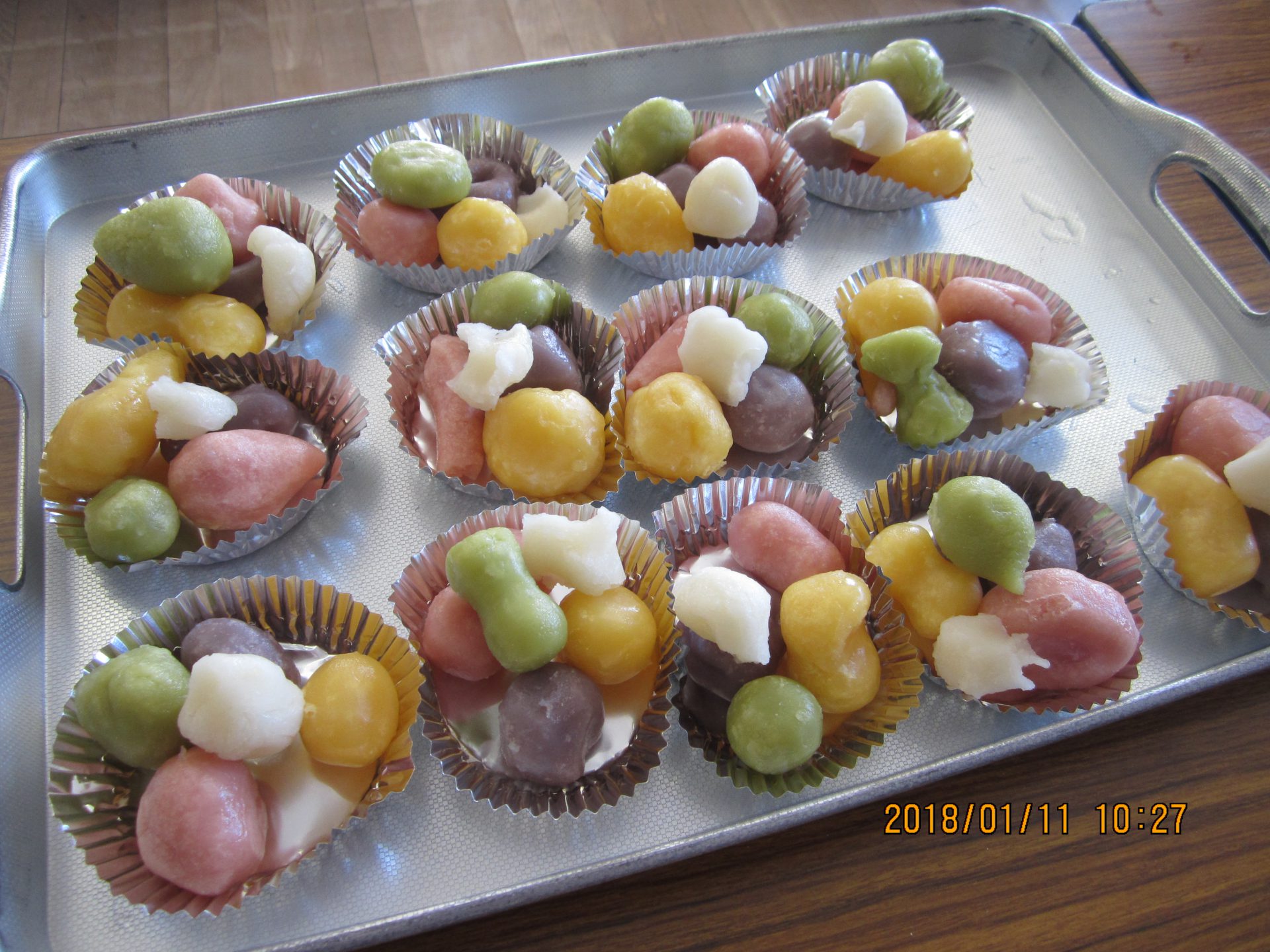 みんなで一緒に作ったおもの。いい香りがしたり、形を作るのが楽しかったり、工夫して作ったみたりとても楽しい時間でした。どの味が一番おいしい?なんて食べるときにはみんなでワイワイ盛り上がりました。1番人気は、ブドウジュースでした。甘いからかな^^