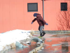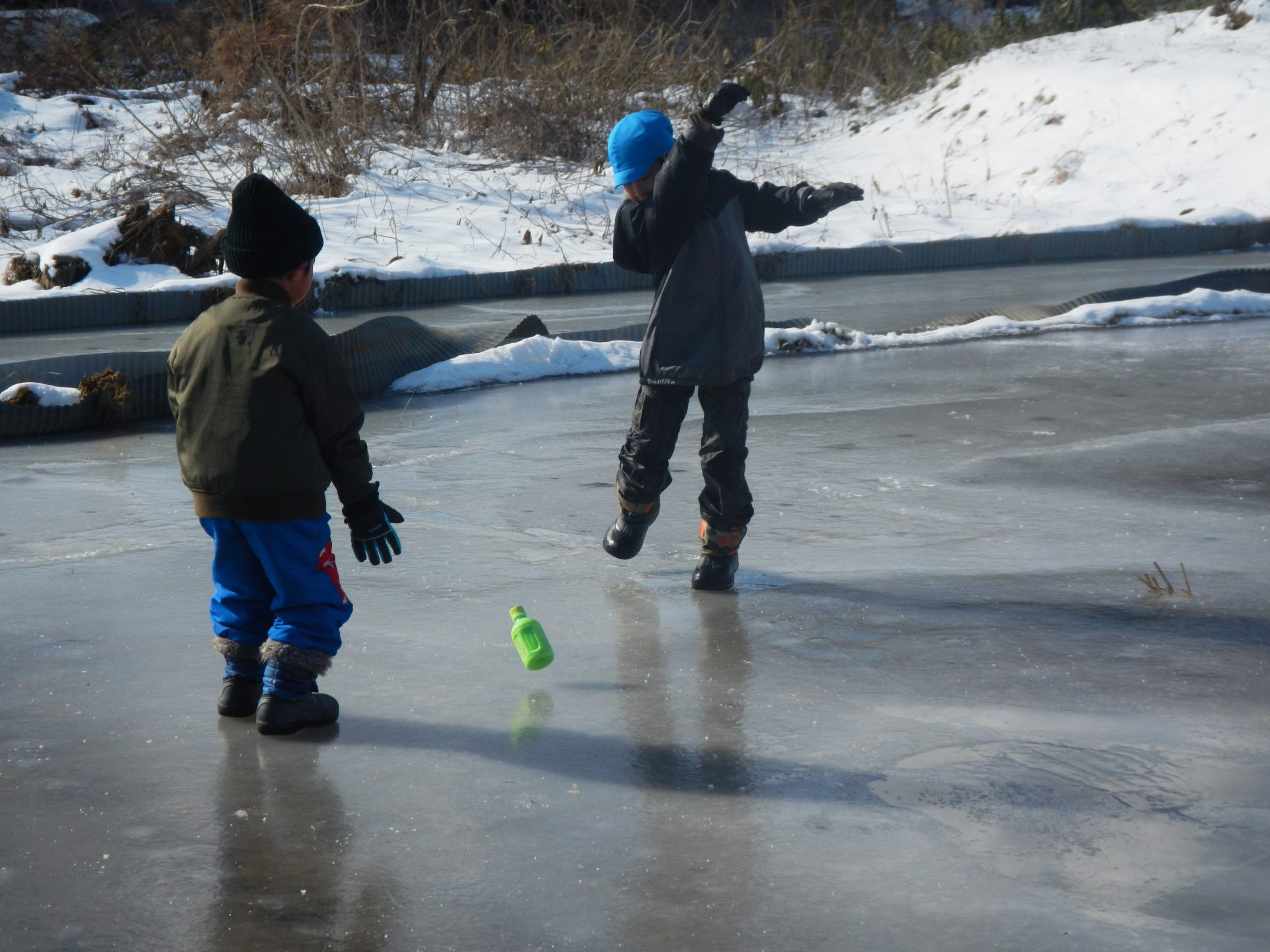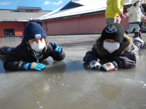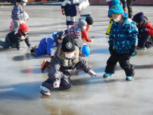 氷の上で転ばないように足を踏ん張ったり、転んでも上手に手を出したりと氷の上での遊び方もとっても上手になりました。