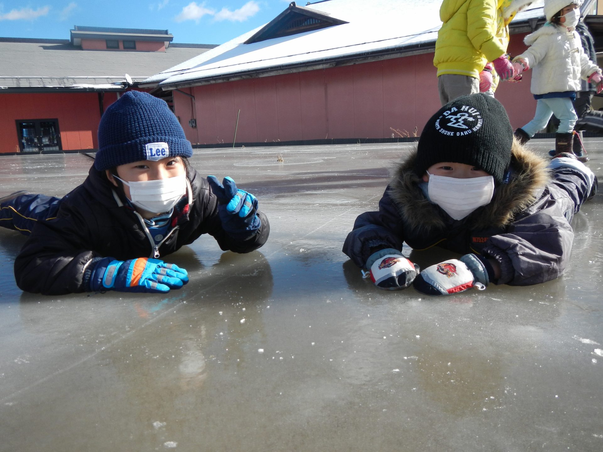 毎年、園児のために田んぼに水を張ってスケートリンクを作って下さる地域の方に、感謝しながら子ども達は楽しく遊ばせてもらいました。冬ならではの遊びを楽しみながら、地域との繋がりを大切にしていきたいと思います。