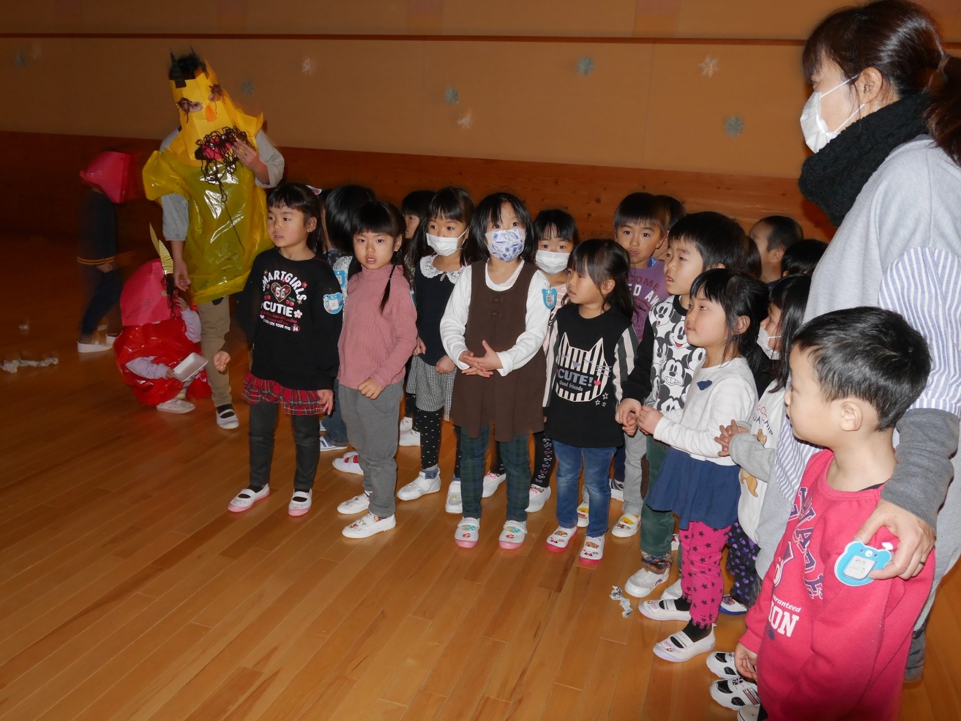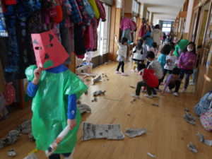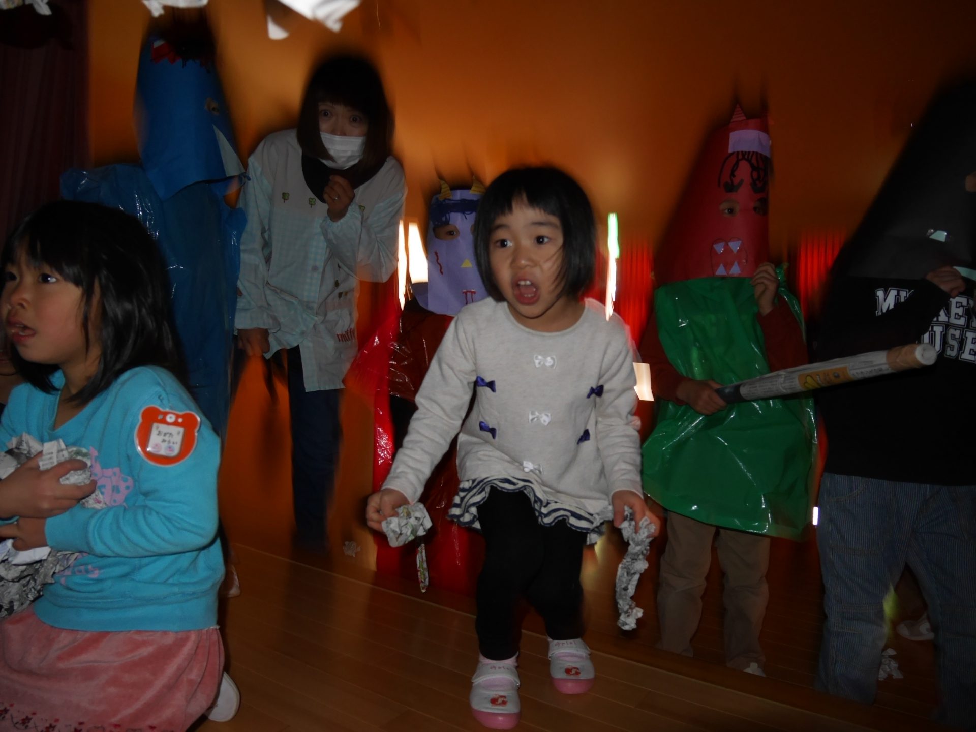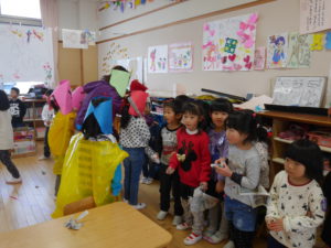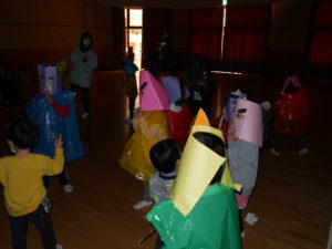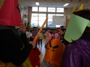 行事のいわれを聞きながら本当に鬼がやってくると信じながら「やっつけたい」という気持ちと「逃げたい」の気持ちが入り混じりながらも早い展開の中で友達や保育士と一緒に戦ったりダンスをしたり、次の作戦を考えたりと子どもたちの気持ちが揺さぶられていくのがよくわかりました。鬼たちも怖がらせないようにしたり優しく導いてくれたり自分たちで考えながらの行動でした。これからの展開に目が離せません。さてもうすぐ節分がやってきます。