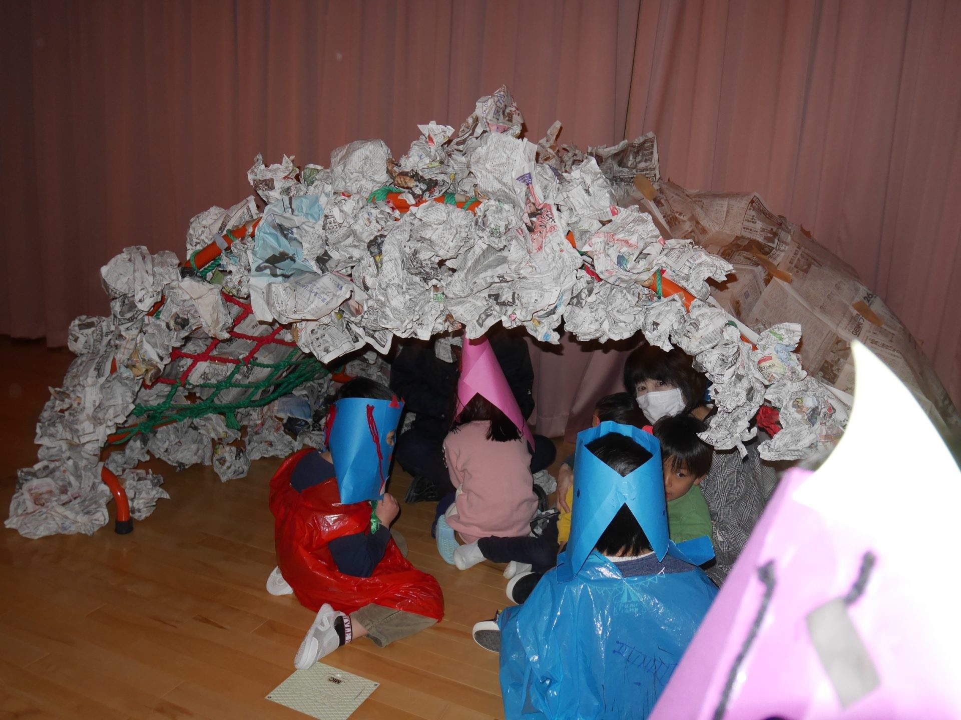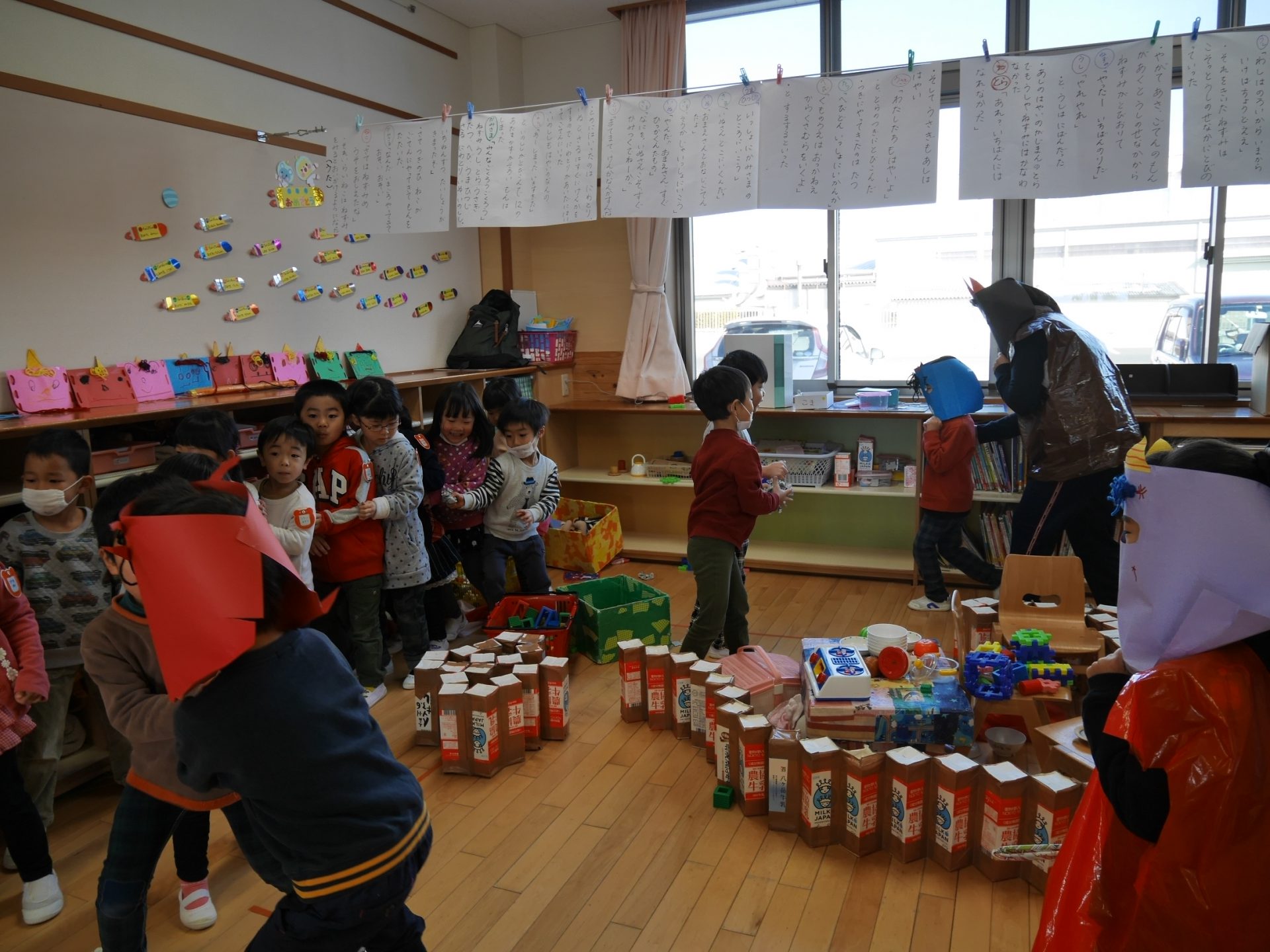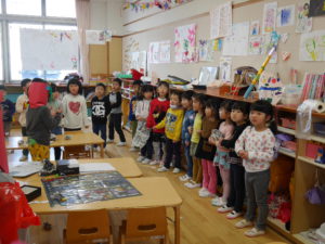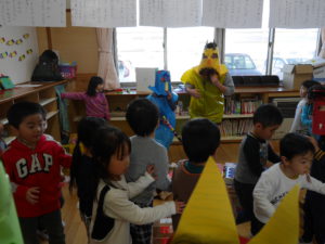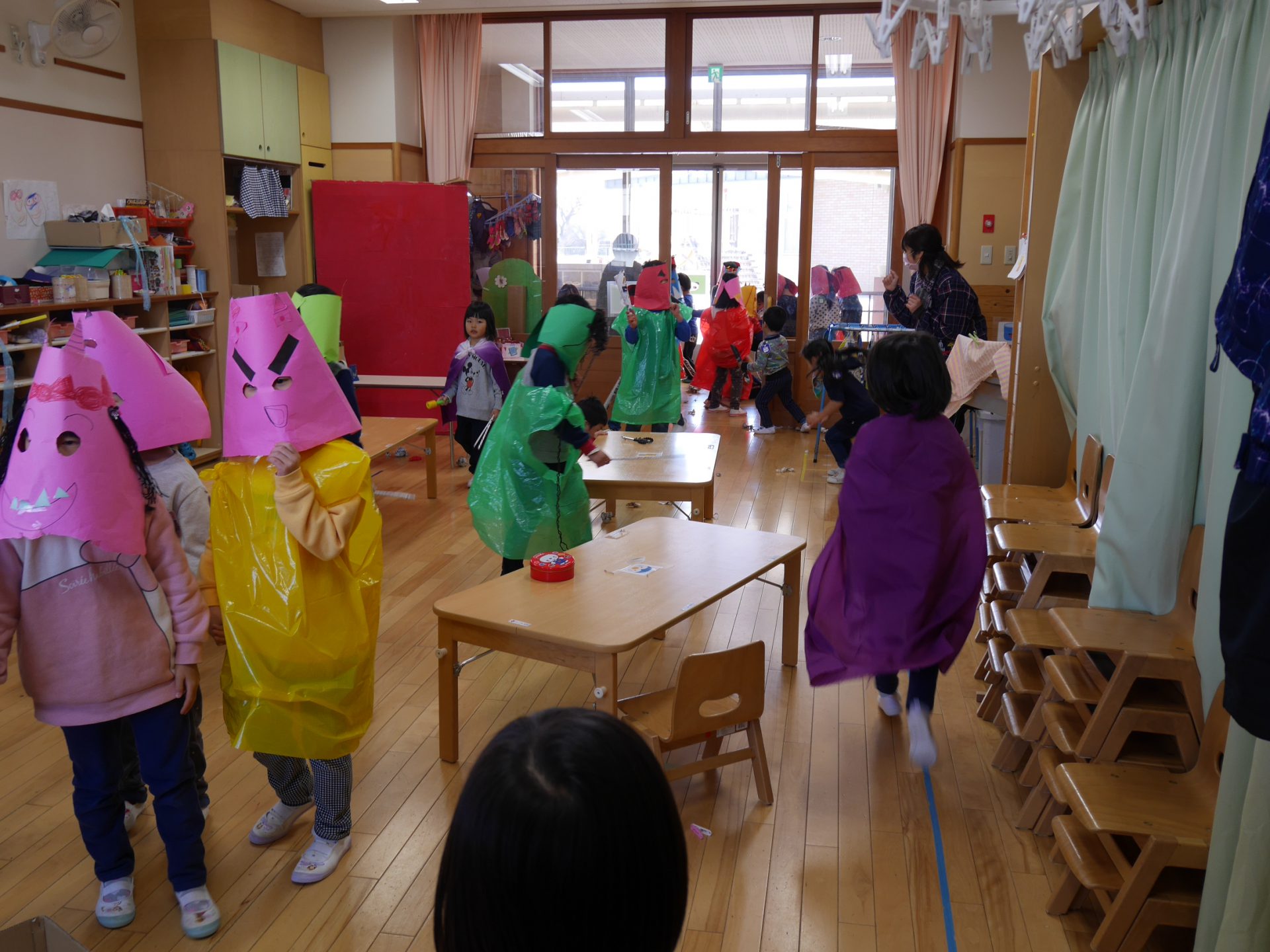 行事のいわれを聞きながら本当に鬼がやってくると信じながら「やっつけたい」という気持ちと「逃げたい」の気持ちが入り混じりながらも早い展開の中で友達や保育士と一緒に戦ったりダンスをしたり、次の作戦を考えたりと子どもたちの気持ちが揺さぶられていくのがよくわかりました。鬼たちも怖がらせないようにしたり優しく導いてくれたり自分たちで考えながらの行動でした。これからの展開に目が離せません。さてもうすぐ節分がやってきます。