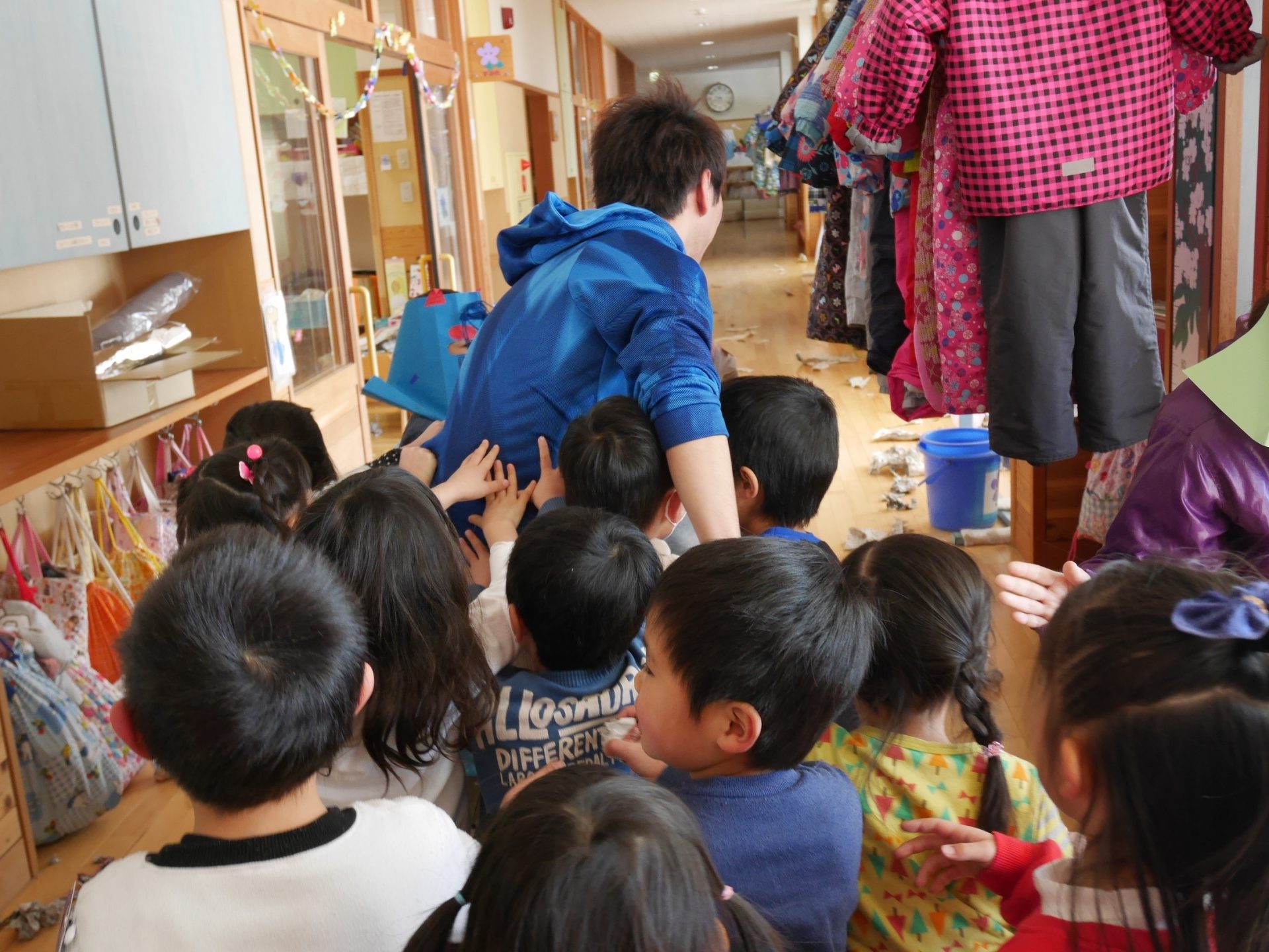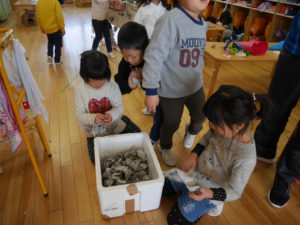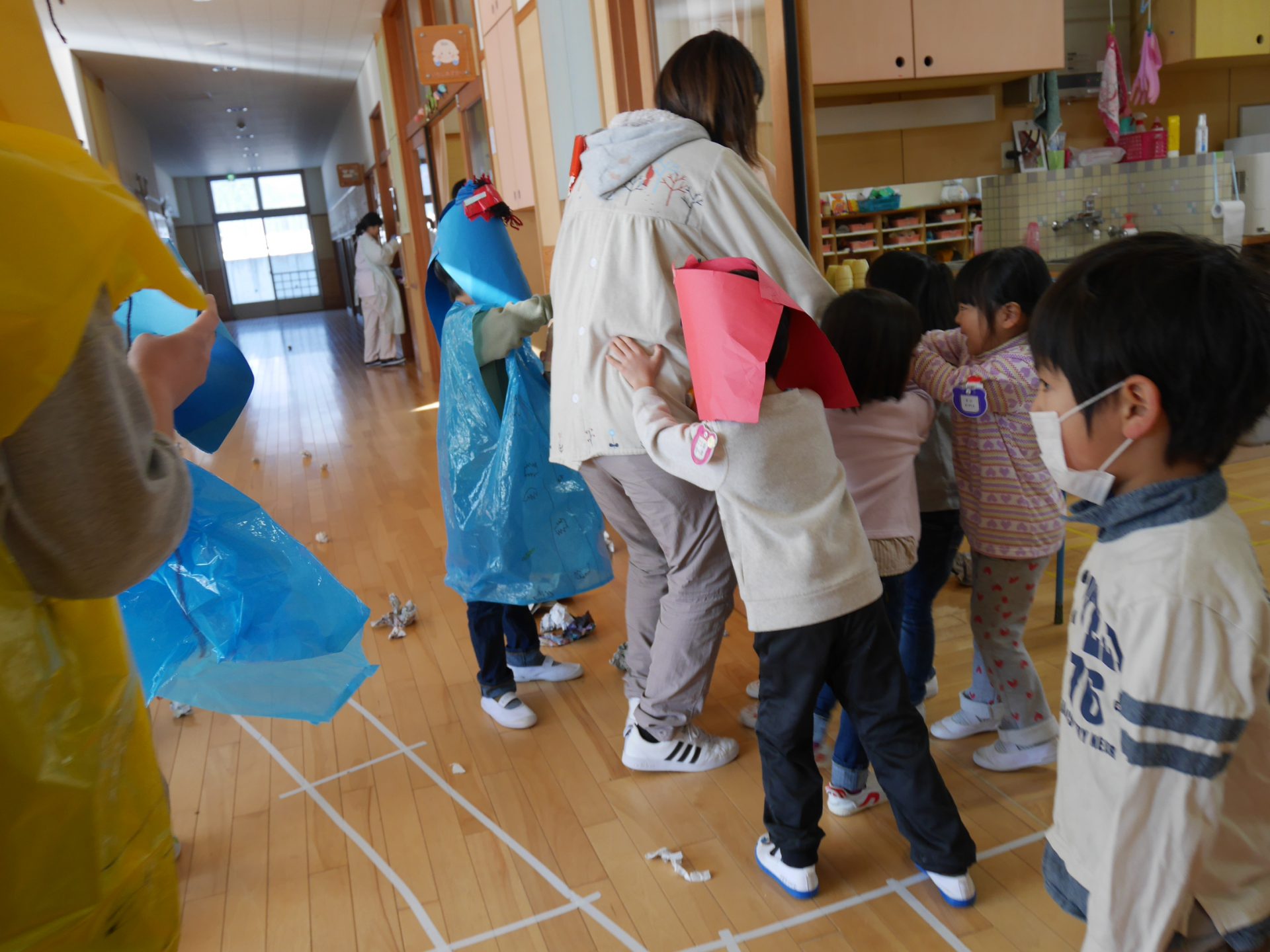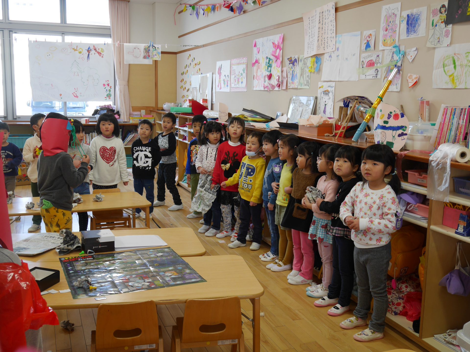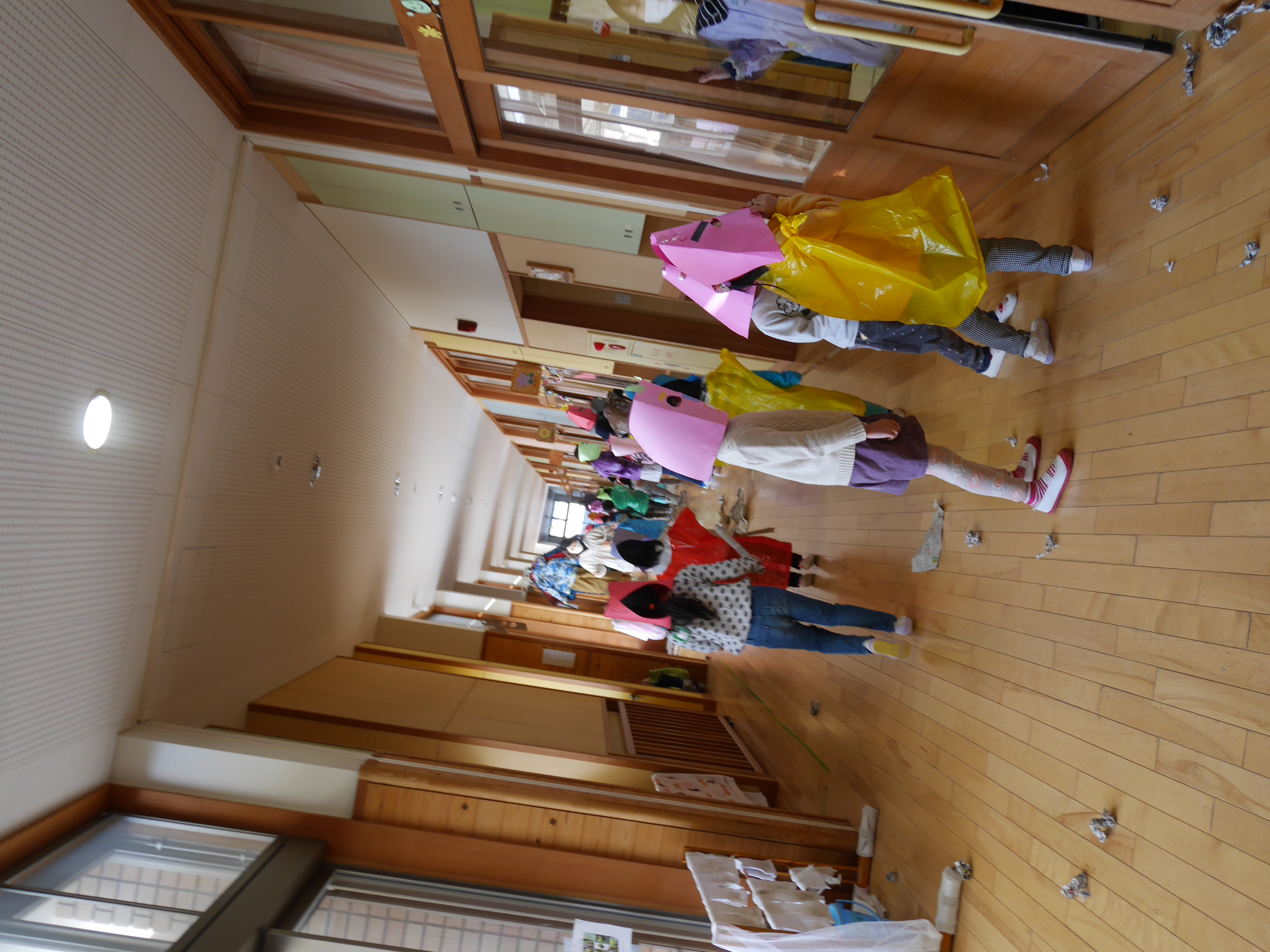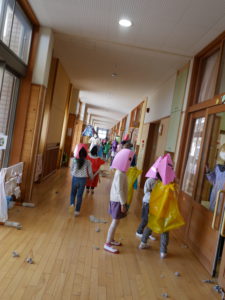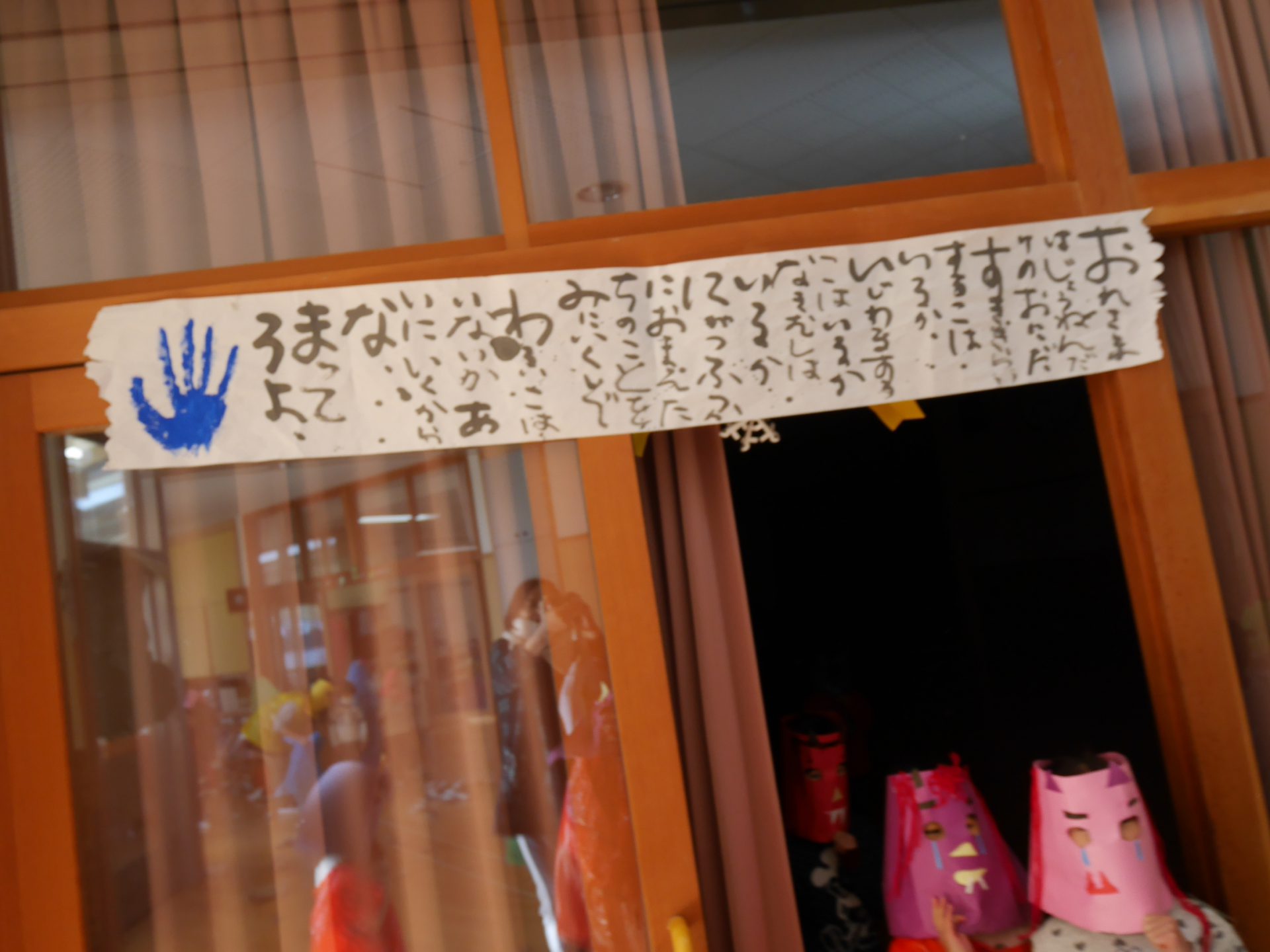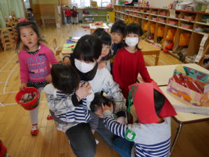 先週辺りから年長さんに似た子鬼や親分鬼が廊下をうろつき始めました。「こわ~い」「あっちへ行って」「面白いね」少しびっくりしていたけれど毎日、毎日鬼は近づいてきました・・・