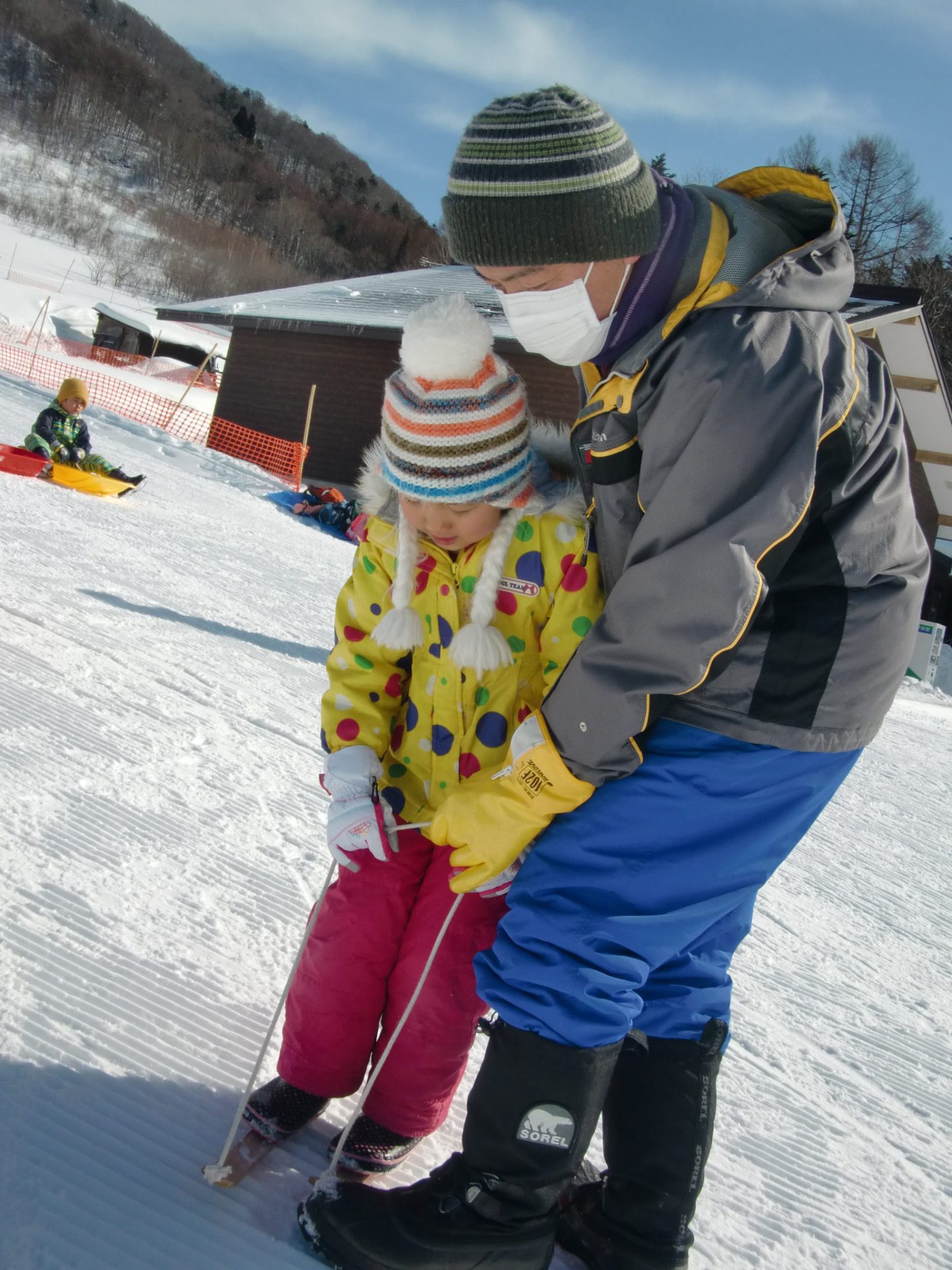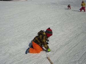 「ブレーキは、かかとを雪につけてつま先をあげると、止まるんだよ」
