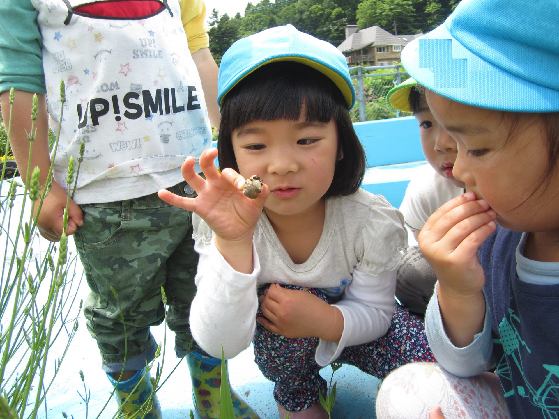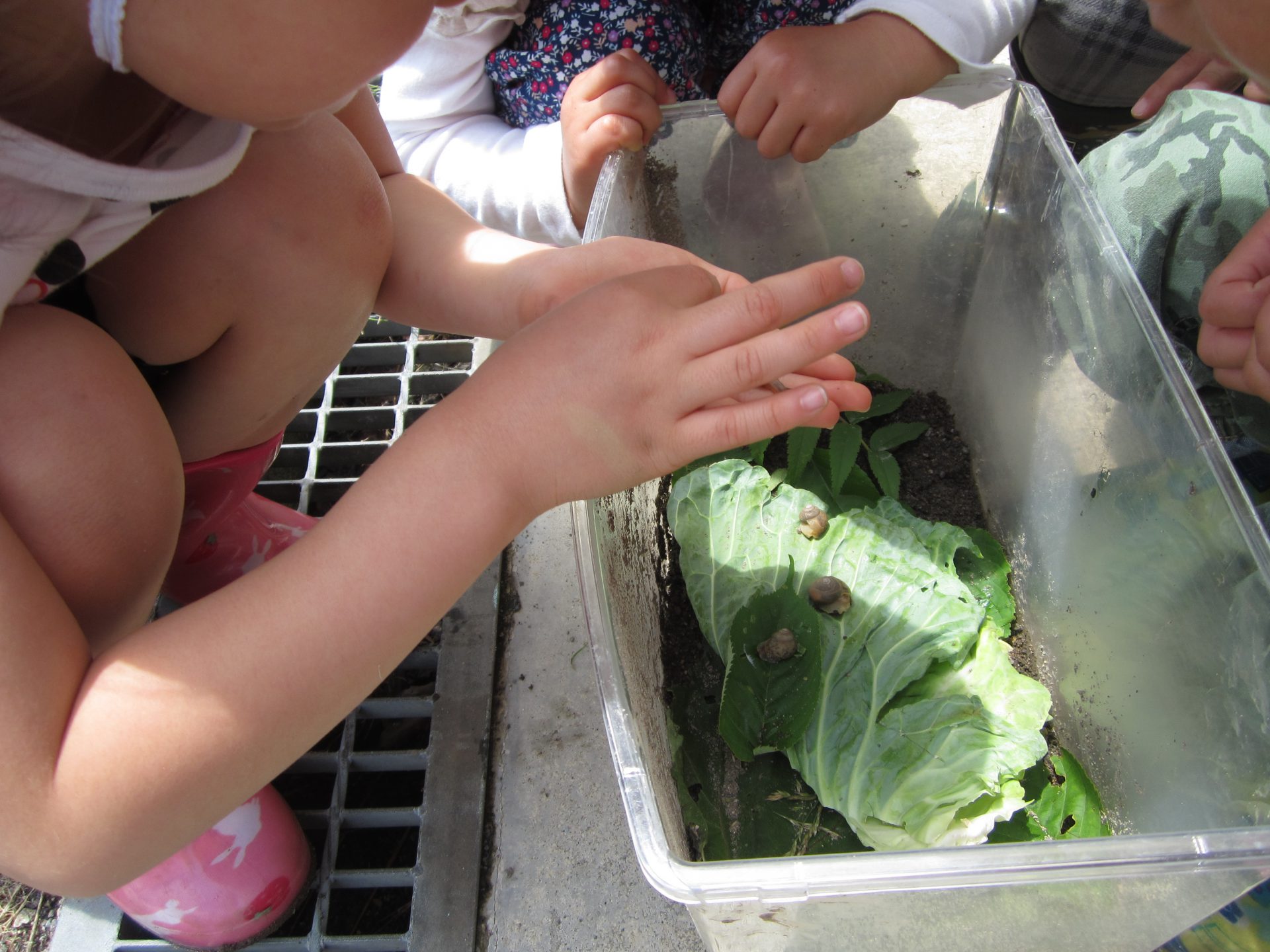 「見せて見せて!」と他の子も集まり、みんなでカタツムリを探しました!