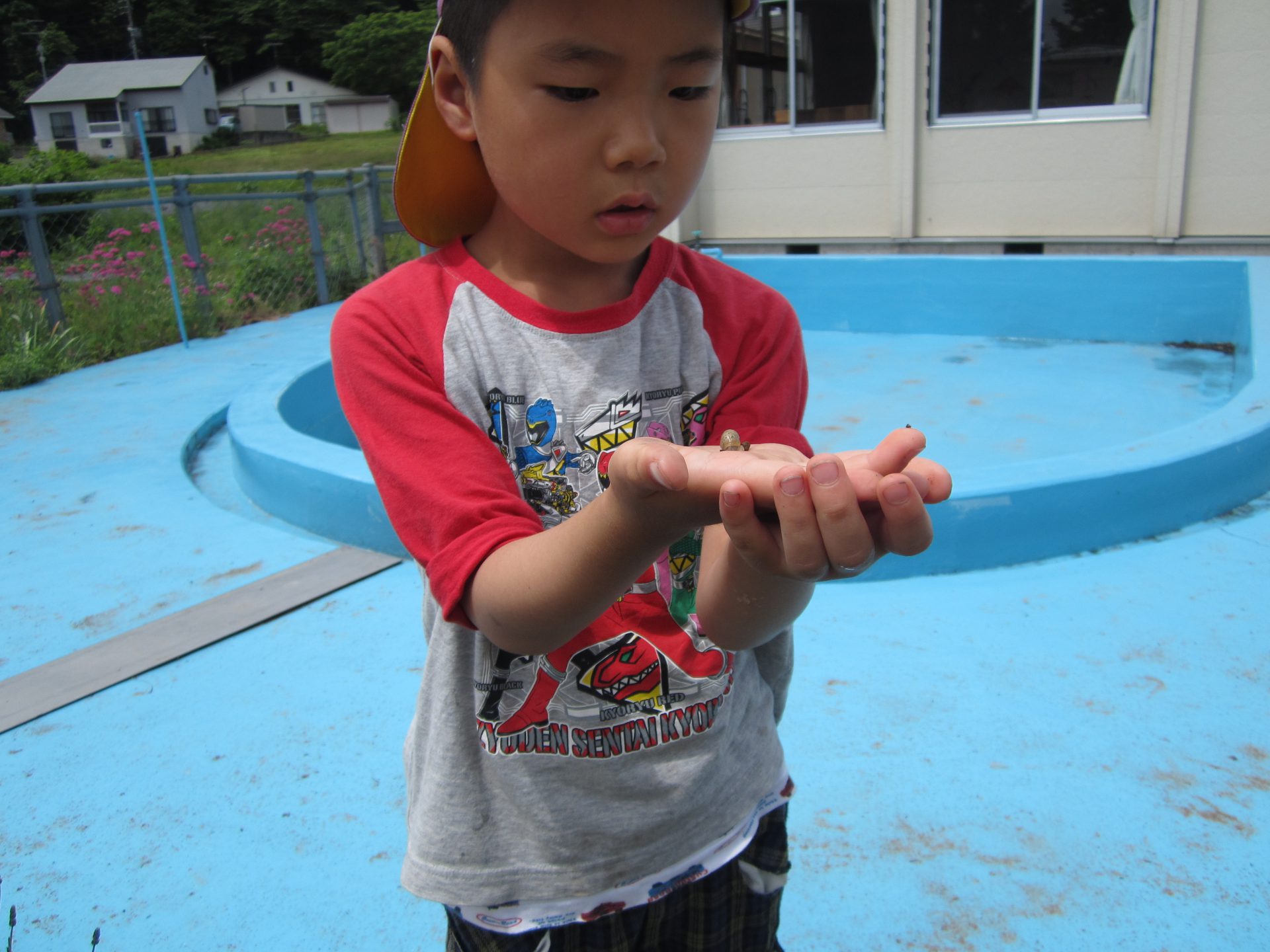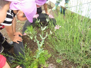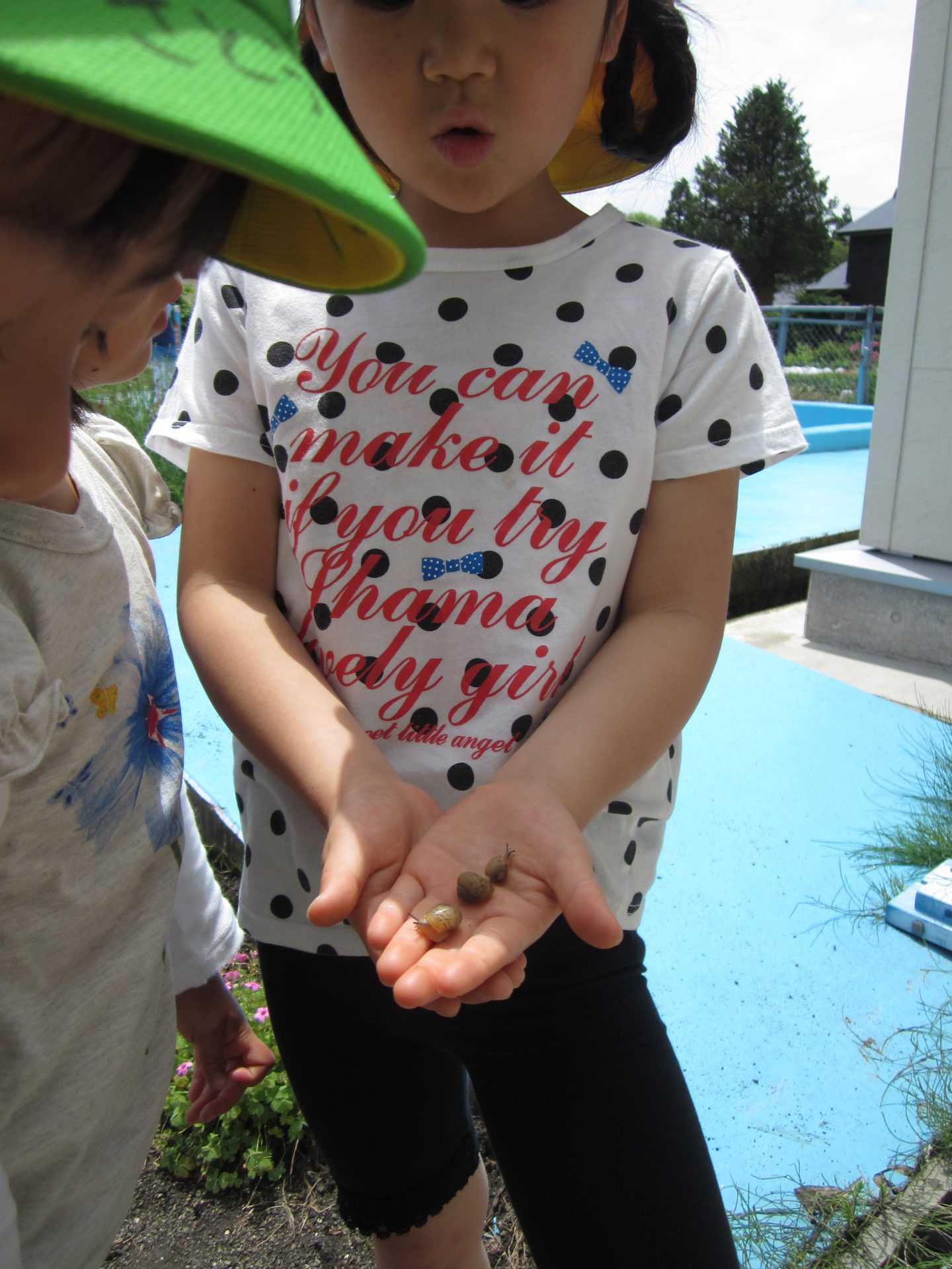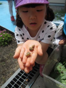 園庭の花壇で子ども達が「かたつむり居た!」と発見しました!