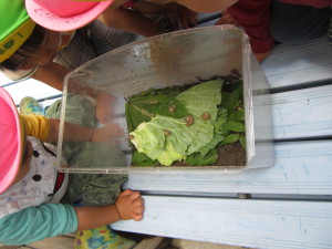 未満児のお友だちもお兄さんお姉さんが見つけたカタツムリを興味津々に見ていました。