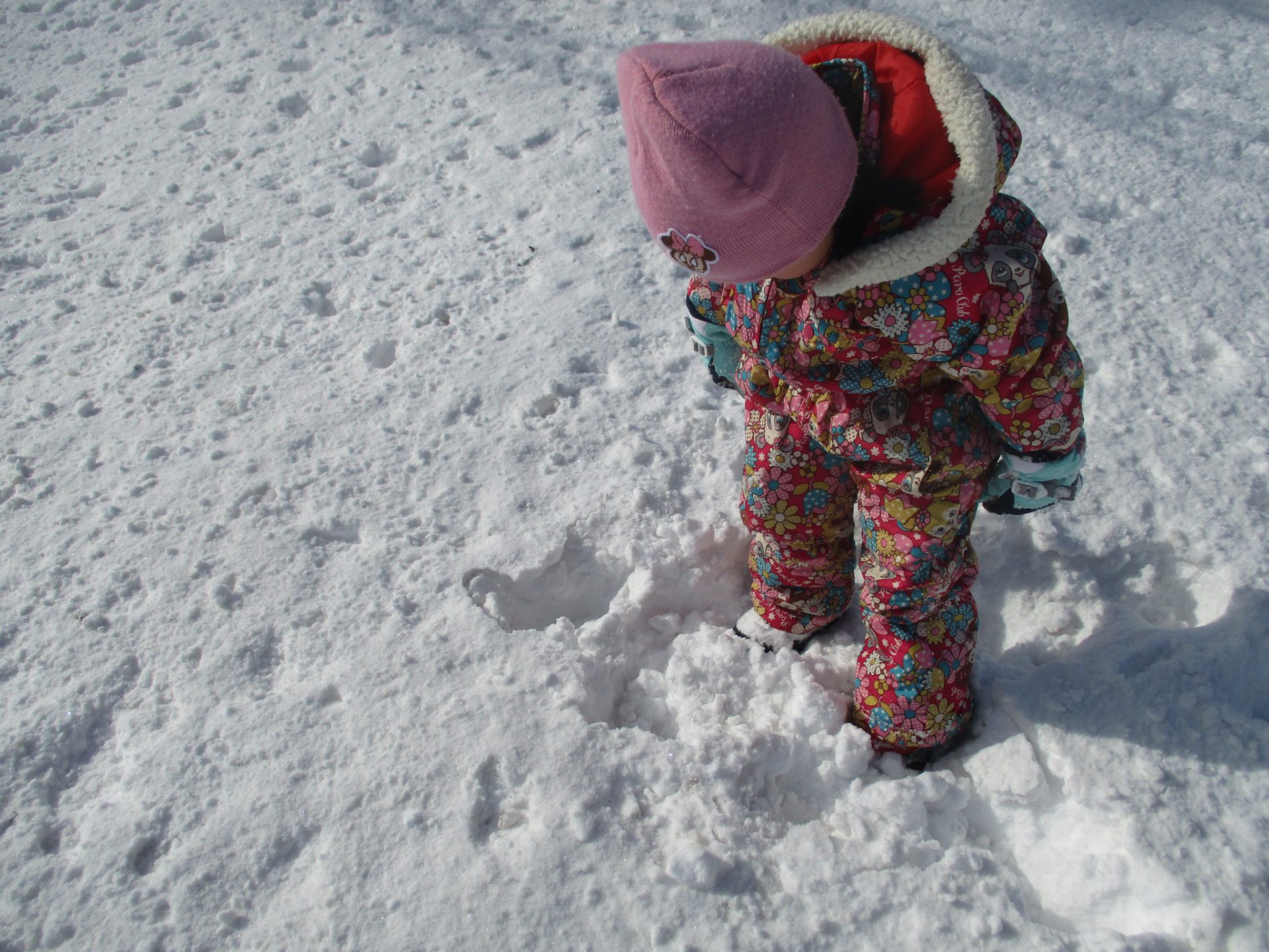 いつもの積もりたての雪と様子が違うことに気づき、不思議に思う姿が。