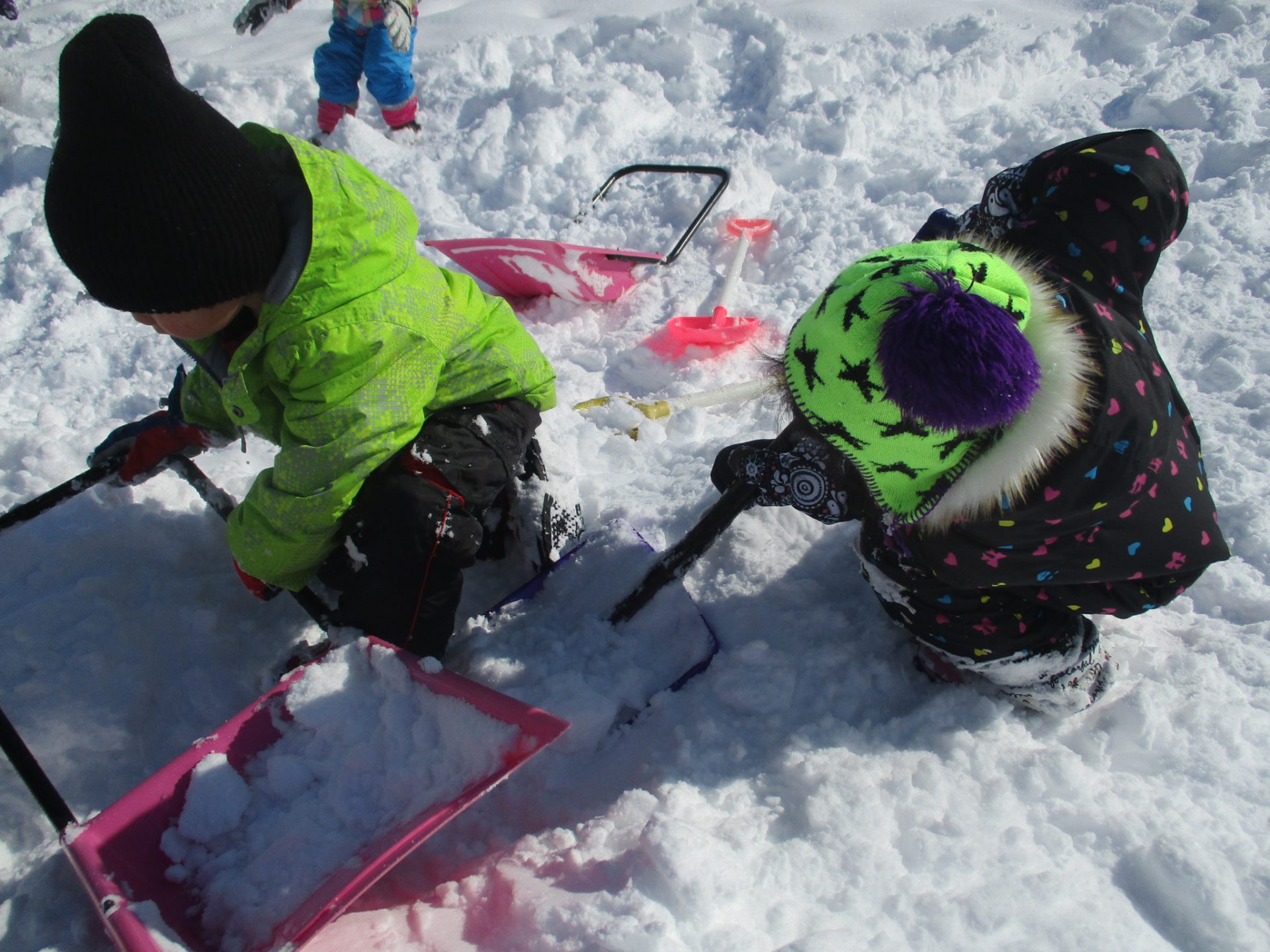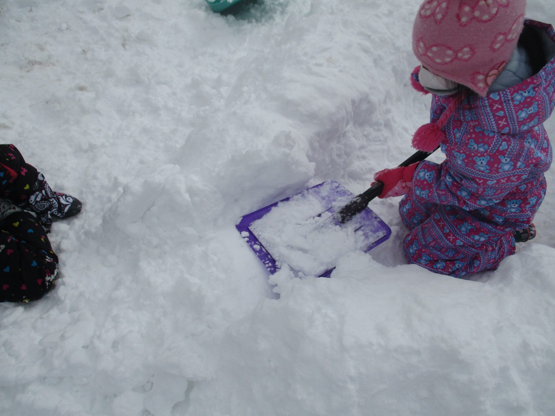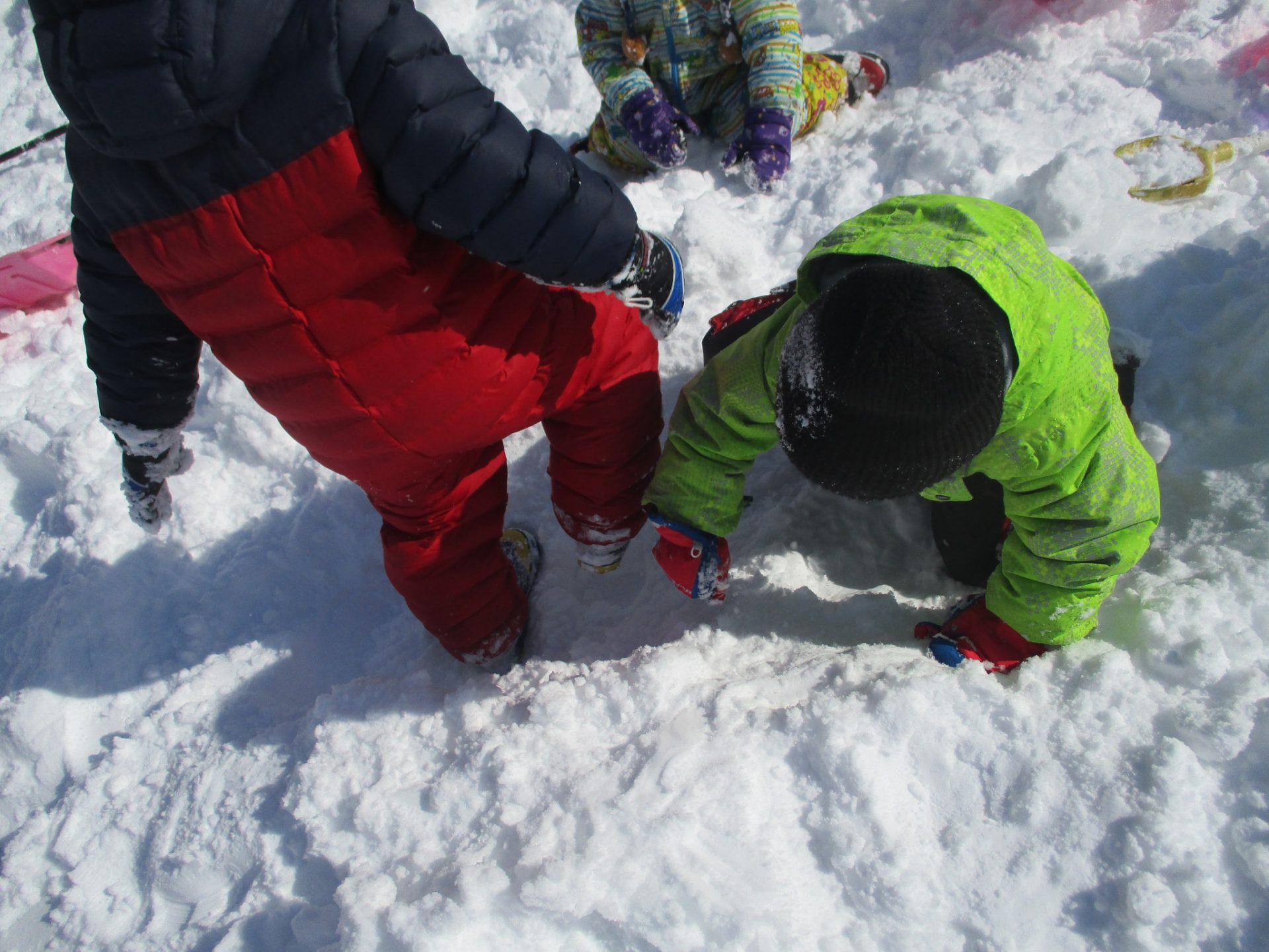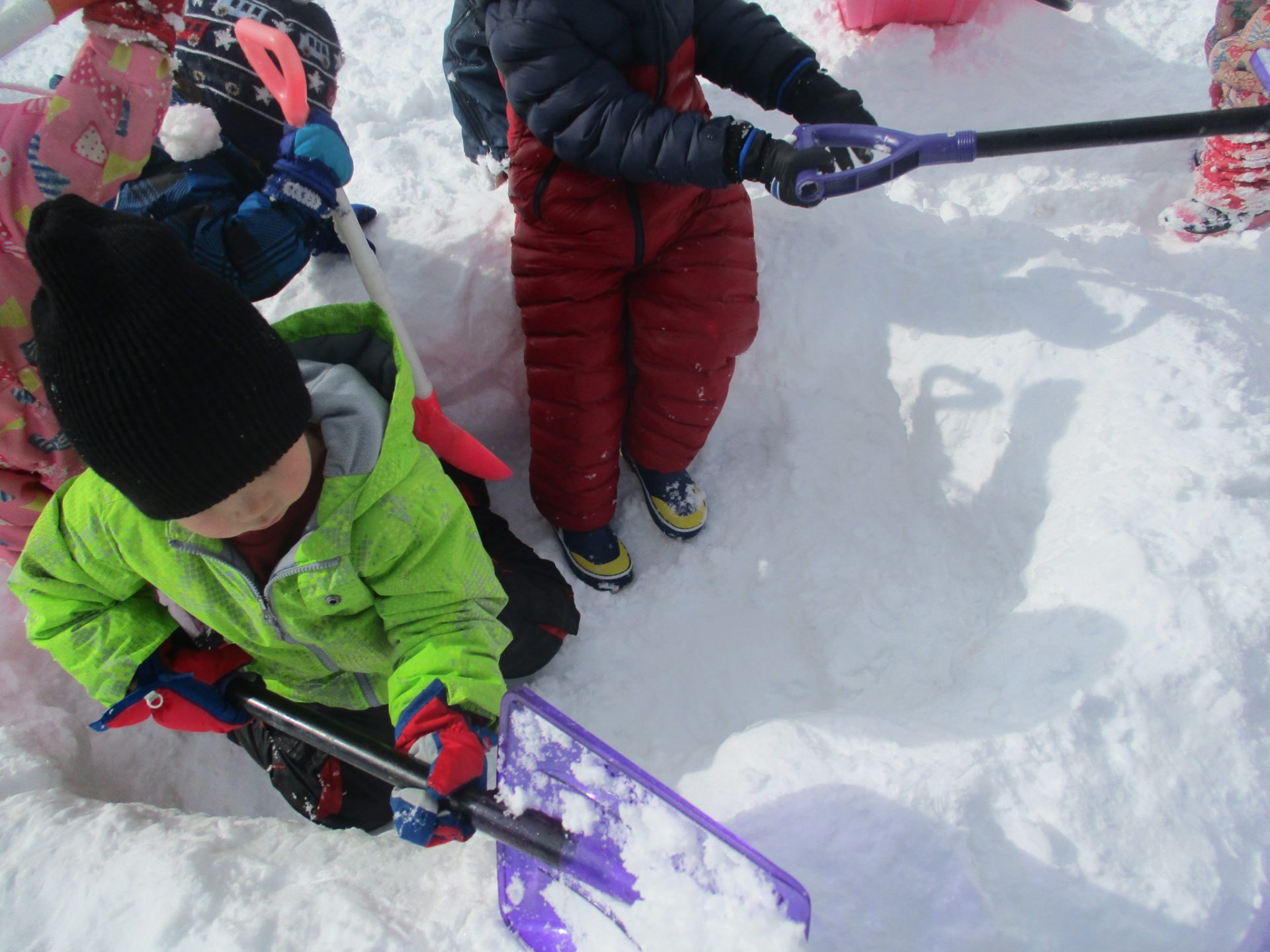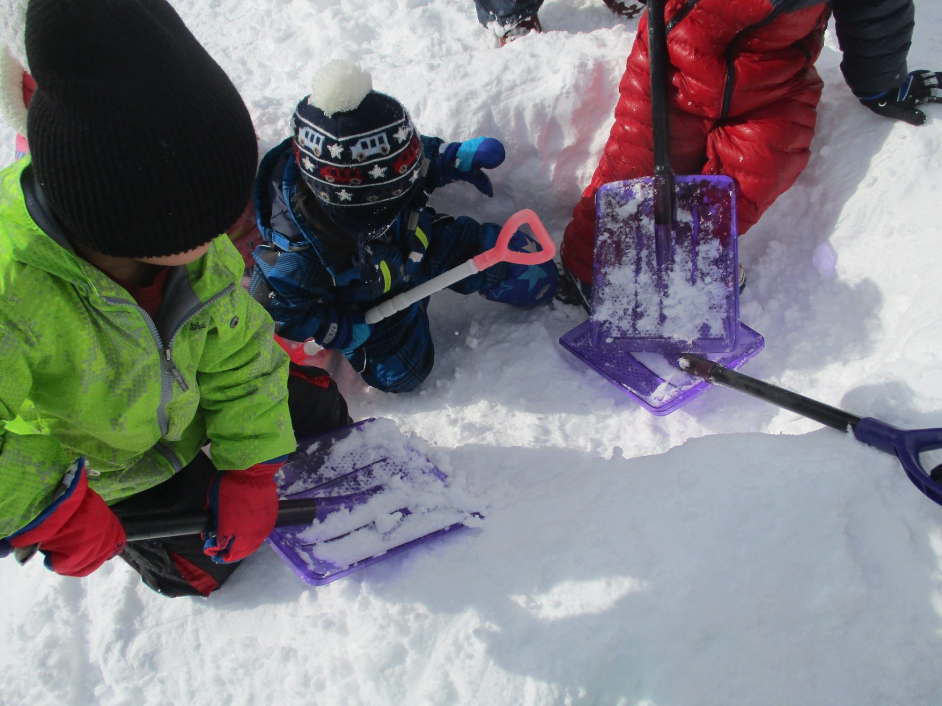 雪遊びを通して、年上の子の道具の使い方やかまくらの作り方を見て真似たり、