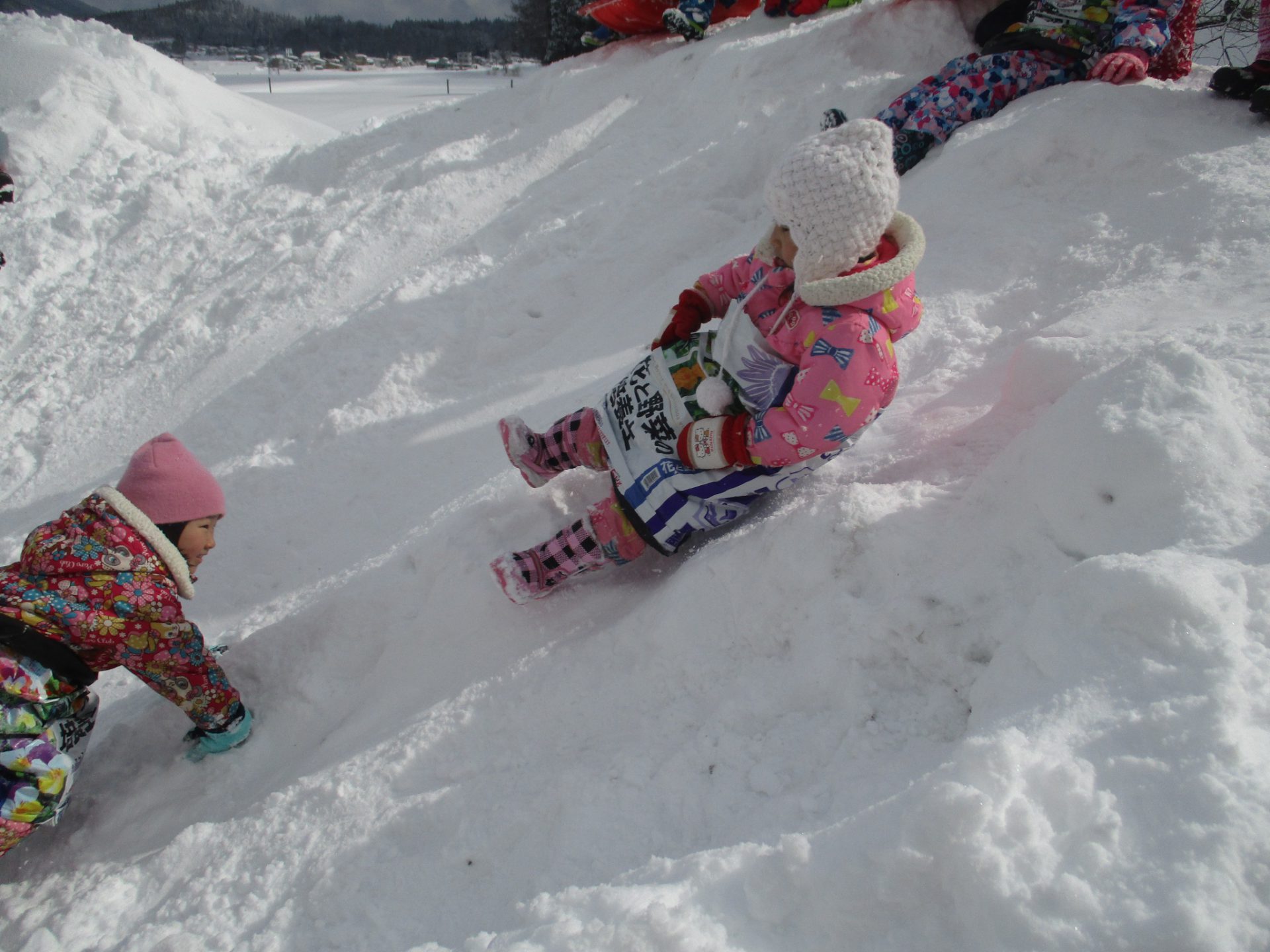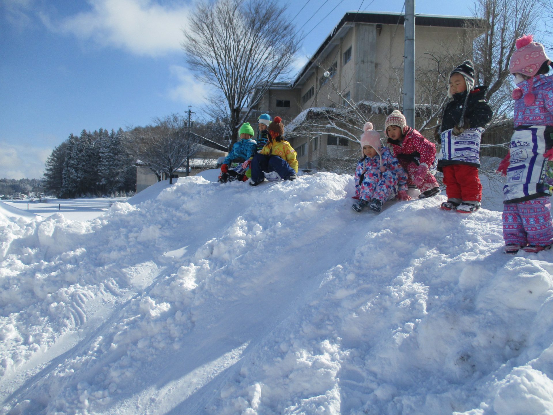こちらでは、園舎裏にできた雪山でそりを楽しむ姿が。。。