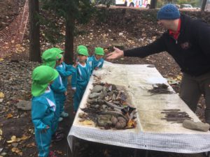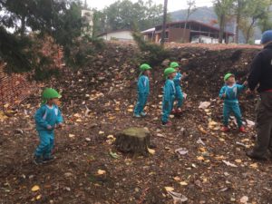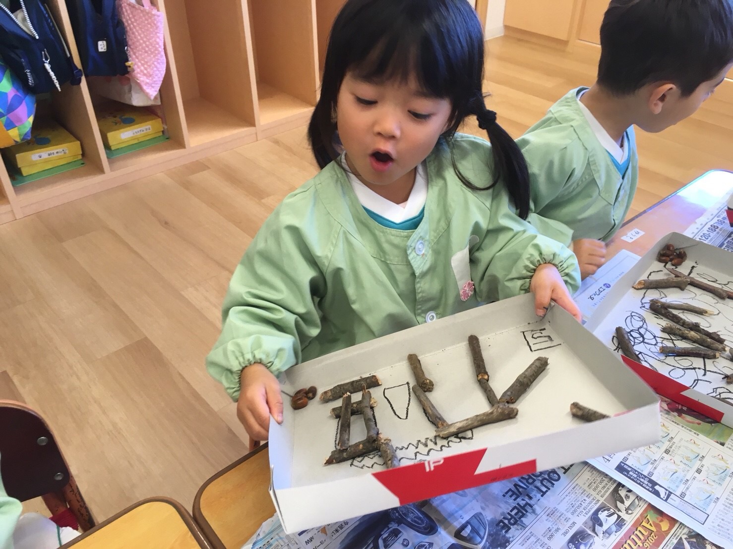 枝やドングリを英語で言うだけでなく、木、葉っぱ、石、大きい、小さいなど遊びの中で出てくる言葉も英語で言い触れるようにしています。