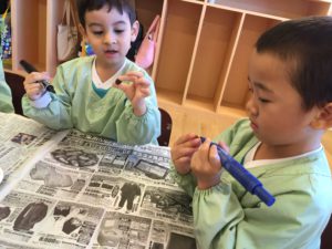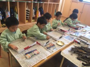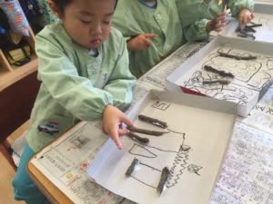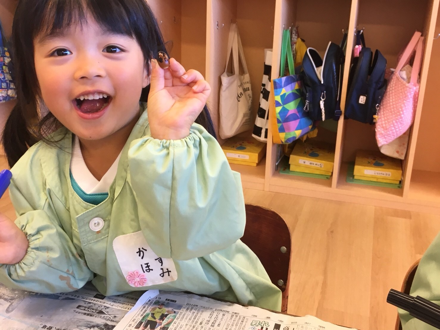 「Good morning」「What’s you are name?」「How old are you?」など、子ども達も覚え、質問し合ったり、他にも、「Go to toilet」→トイレに行こう 「Wash you are hands」→手を洗おう など、日々使う会話を英語で楽しみながら、触れています。