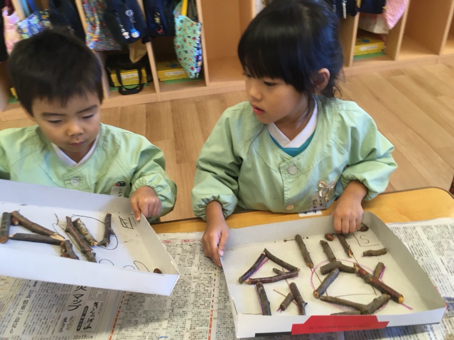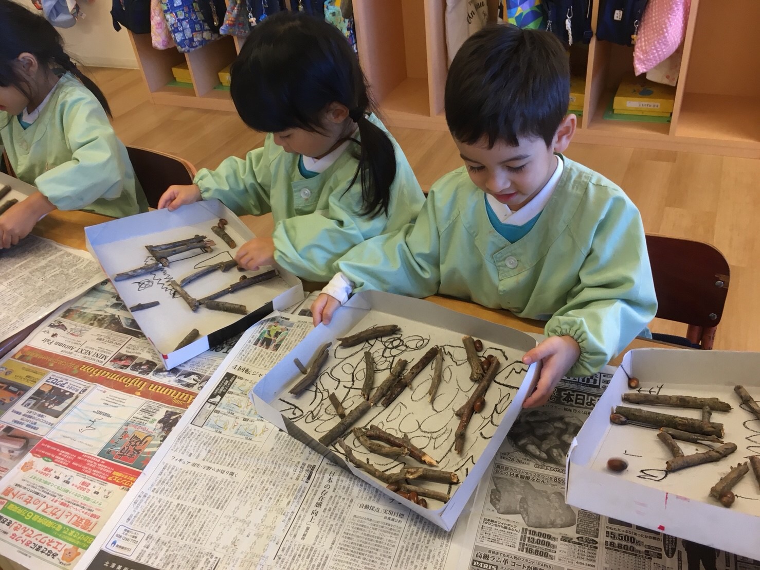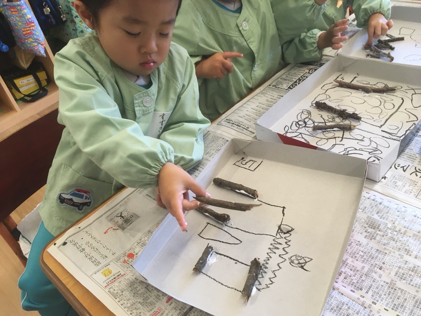 枝やドングリを見つけ、教室に戻り迷路作り。