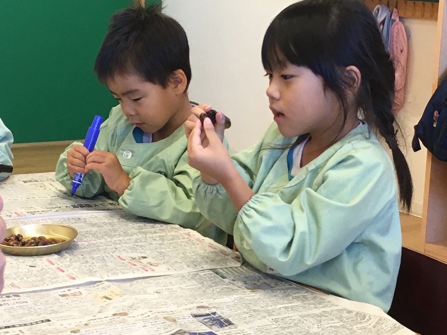 2日目は、ドングリに顔を描いて、迷路遊びをしました。